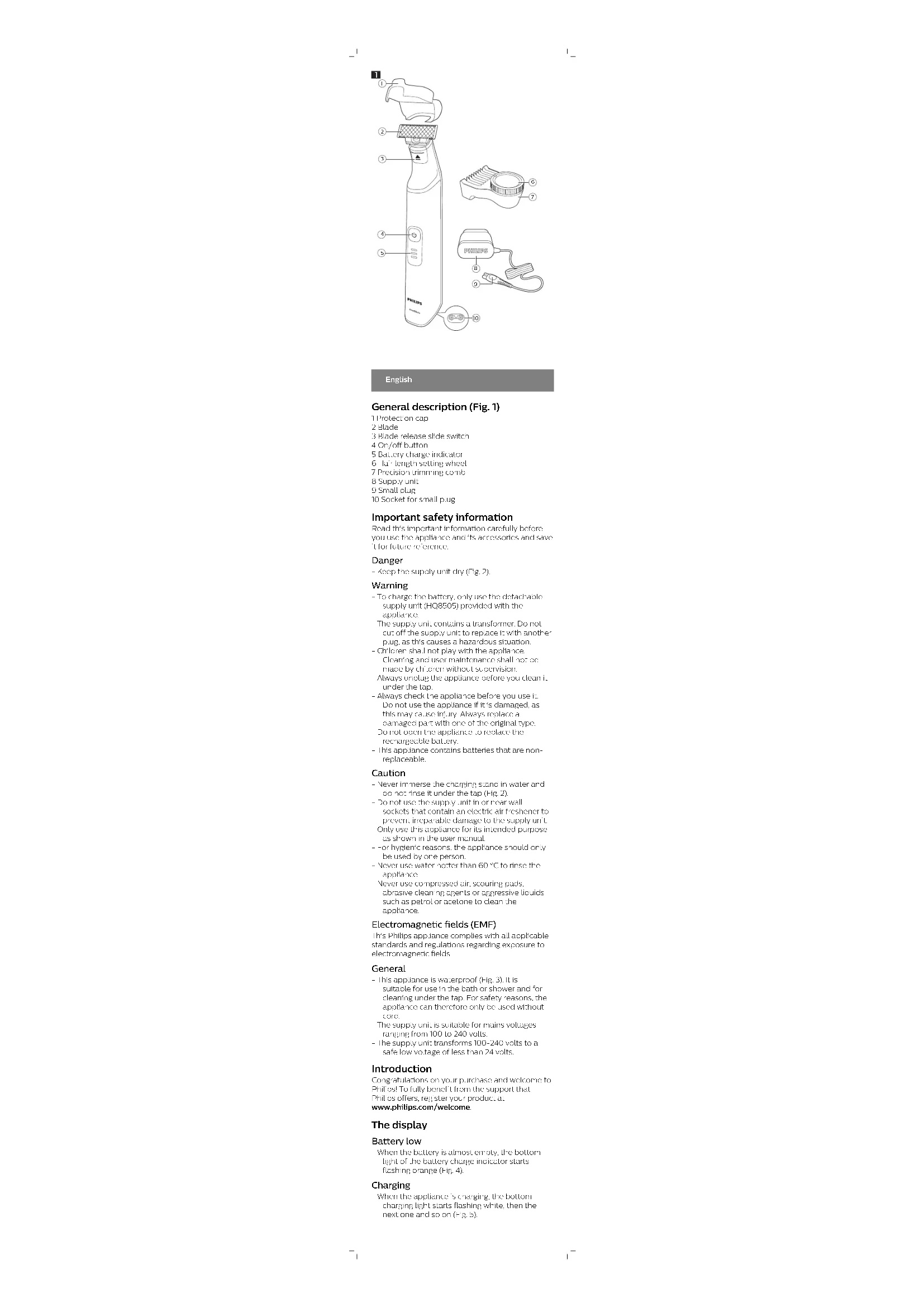 >75 % recycled paper >75 % papier recycléEnglish General description (Fig. 1) 1 Protection cap 2 Blade 3 Blade release slide switch 4 On/off button 5 Battery charge indicator 6 Hair length setting wheel 7 Precision trimming comb 8 Supply unit 9 Small plug 10 Socket for small plug Important safety information Read this important information carefully before you use the appliance and its accessories and save it for future reference. Danger - Keep the supply unit dry (Fig. 2). Warning - To charge the battery, only use the detachable supply unit (HQ8505) provided with the appliance. - The supply unit contains a transformer. Do not cut off the supply unit to replace it with another plug, as this causes a hazardous situation. - Children shall not play with the appliance. Cleaning and user maintenance shall not be made by children without supervision. - Always unplug the appliance before you clean it under the tap. - Always check the appliance before you use it. Do not use the appliance if it is damaged, as this may cause injury. Always replace a damaged part with one of the original type. - Do not open the appliance to replace the rechargeable battery. - This appliance contains batteries that are non- replaceable. Caution - Never immerse the charging stand in water and do not rinse it under the tap (Fig. 2). - Do not use the supply unit in or near wall sockets that contain an electric air freshener to prevent irreparable damage to the supply unit. - Only use this appliance for its intended purpose as shown in the user manual. - For hygienic reasons, the appliance should only be used by one person. - Never use water hotter than 60°C to rinse the appliance. - Never use compressed air, scouring pads, abrasive cleaning agents or aggressive liquids such as petrol or acetone to clean the appliance. Electromagnetic fields (EMF) This Philips appliance complies with all applicable standards and regulations regarding exposure to electromagnetic fields. General - This appliance is waterproof (Fig. 3). It is suitable for use in the bath or shower and for cleaning under the tap. For safety reasons, the appliance can therefore only be used without cord. - The supply unit is suitable for mains voltages ranging from 100 to 240 volts. - The supply unit transforms 100-240 volts to a safe low voltage of less than 24 volts. Introduction Congratulations on your purchase and welcome to Philips! To fully benefit from the support that Philips offers, register your product at www.philips.com/welcome. The display Battery low - When the battery is almost empty, the bottom light of the battery charge indicator starts flashing orange (Fig. 4). Charging - When the appliance is charging, the bottom charging light starts flashing white, then the next one and so on (Fig. 5).