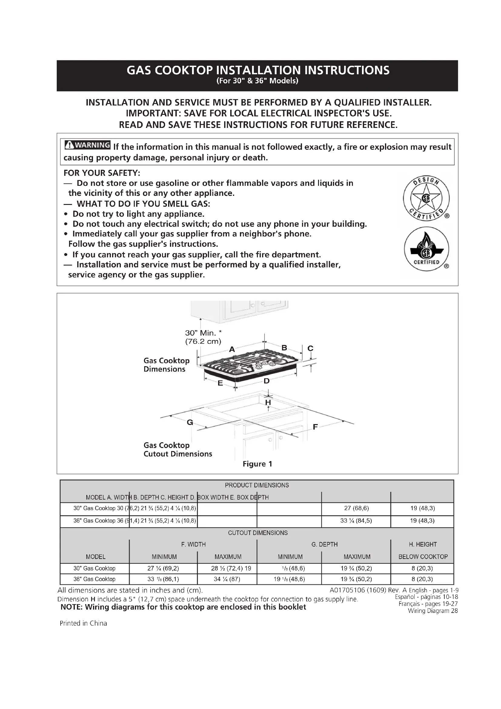 - If you cannot reach your gas supplier, call the fire department. — Installation and service must be performed by a qualified installer, service agency or the gas supplier. All dimensions are stated in inches and (cm). Dimension H includes a 5" (12,7 cm) space underneath the cooktop for connection to gas supply line. NOTE: Wiring diagrams for this cooktop are enclosed in this booklet Figure 1 Printed in China Gas Cooktop Cutout Dimensions Gas Cooktop Dimensions PRODUCT DIMENSIONSMODEL A. WIDTH B. DEPTH C. HEIGHT D. BOX WIDTH E. BOX DEPTH30" Gas Cooktop 30 (76,2) 21 ¾ (55,2) 4 ¼ (10,8)27 (68,6) 19 (48,3)36" Gas Cooktop 36 (91,4) 21 ¾ (55,2) 4 ¼ (10,8)33 ¼ (84,5) 19 (48,3) CUTOUT DIMENSIONSF. WIDTH G. DEPTH H. HEIGHT MODEL MINIMUM MAXIMUM MINIMUM MAXIMUM BELOW COOKTOP 30" Gas Cooktop27 ¼ (69,2) 28 ½ (72,4) 19