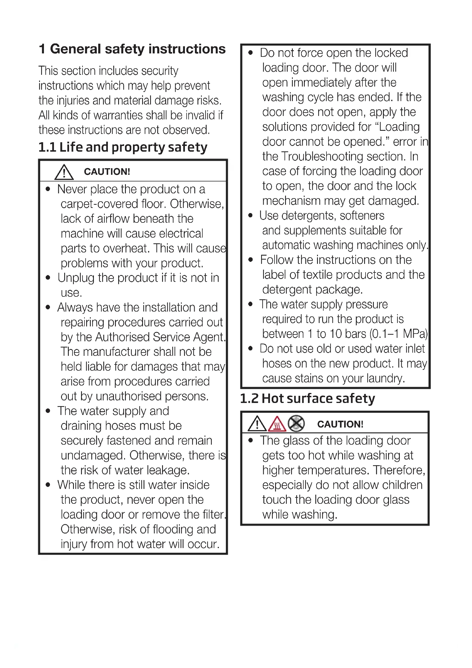 - The glass of the loading door gets too hot while washing at higher temperatures. Therefore, especially do not allow children touch the loading door glass while washing. This section includes security instructions which may help prevent the injuries and material damage risks. All kinds of warranties shall be invalid if these instructions are not observed.