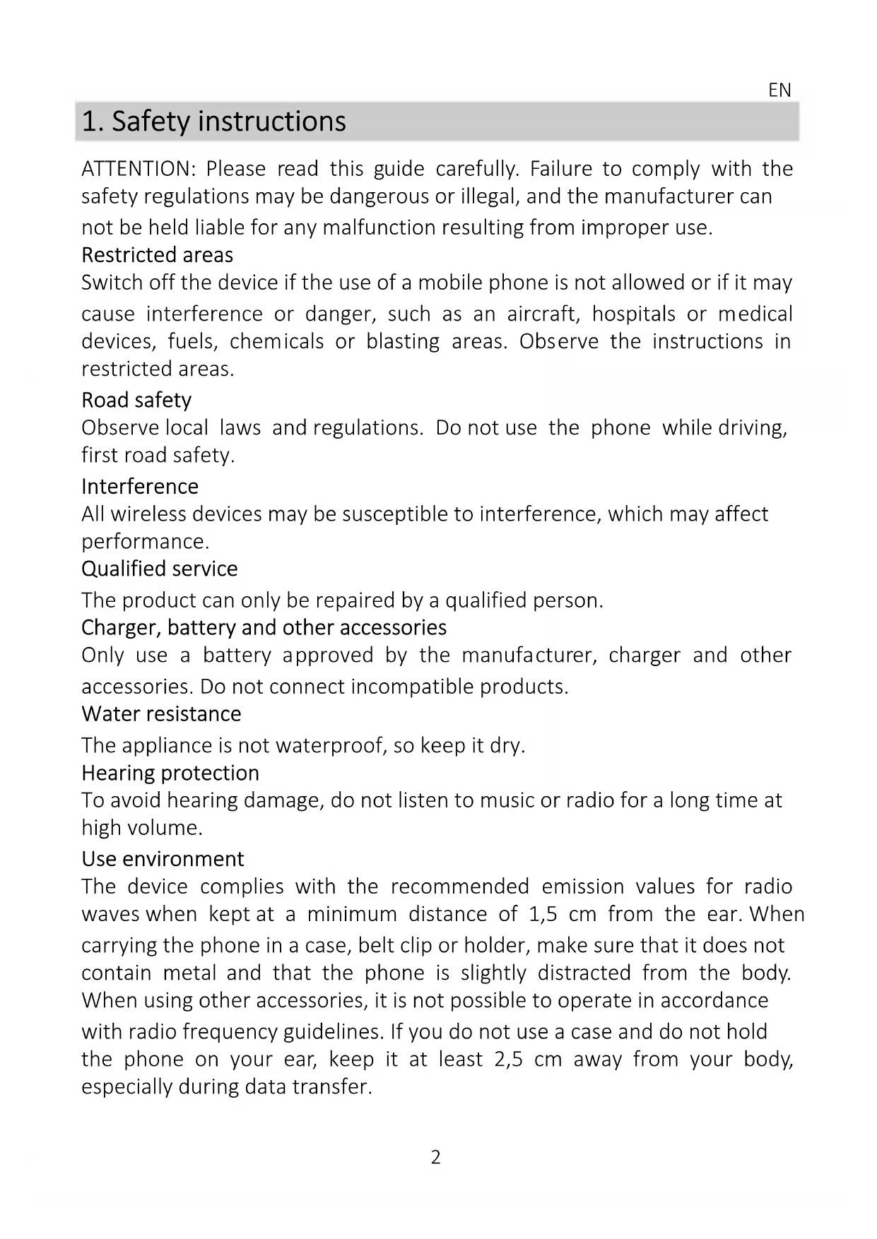 ATTENTION: Please read this guide carefully. Failure to comply with the safety regulations may be dangerous or illegal, and the manufacturer can not be held liable for any malfunction resulting from improper use. Restricted areas Switch off the device if the use of a mobile phone is not allowed or if it may cause interference or danger, such as an aircraft, hospitals or medical devices, fuels, chemicals or blasting areas. Observe the instructions in restricted areas. Road safety Observe local laws and regulations. Do not use the phone while driving, first road safety. Interference All wireless devices may be susceptible to interference, which may affect performance. Qualified service The product can only be repaired by a qualified person. Charger, battery and other accessories Only use a battery approved by the manufacturer, charger and other accessories. Do not connect incompatible products. Water resistance The appliance is not waterproof, so keep it dry. Hearing protection To avoid hearing damage, do not listen to music or radio for a long time at high volume. Use environment The device complies with the recommended emission values for radio waves when kept at a minimum distance of 1,5 cm from the ear. When carrying the phone in a case, belt clip or holder, make sure that it does not contain metal and that the phone is slightly distracted from the body. When using other accessories, it is not possible to operate in accordance with radio frequency guidelines. If you do not use a case and do not hold the phone on your ear, keep it at least 2,5 cm away from your body, especially during data transfer.EN