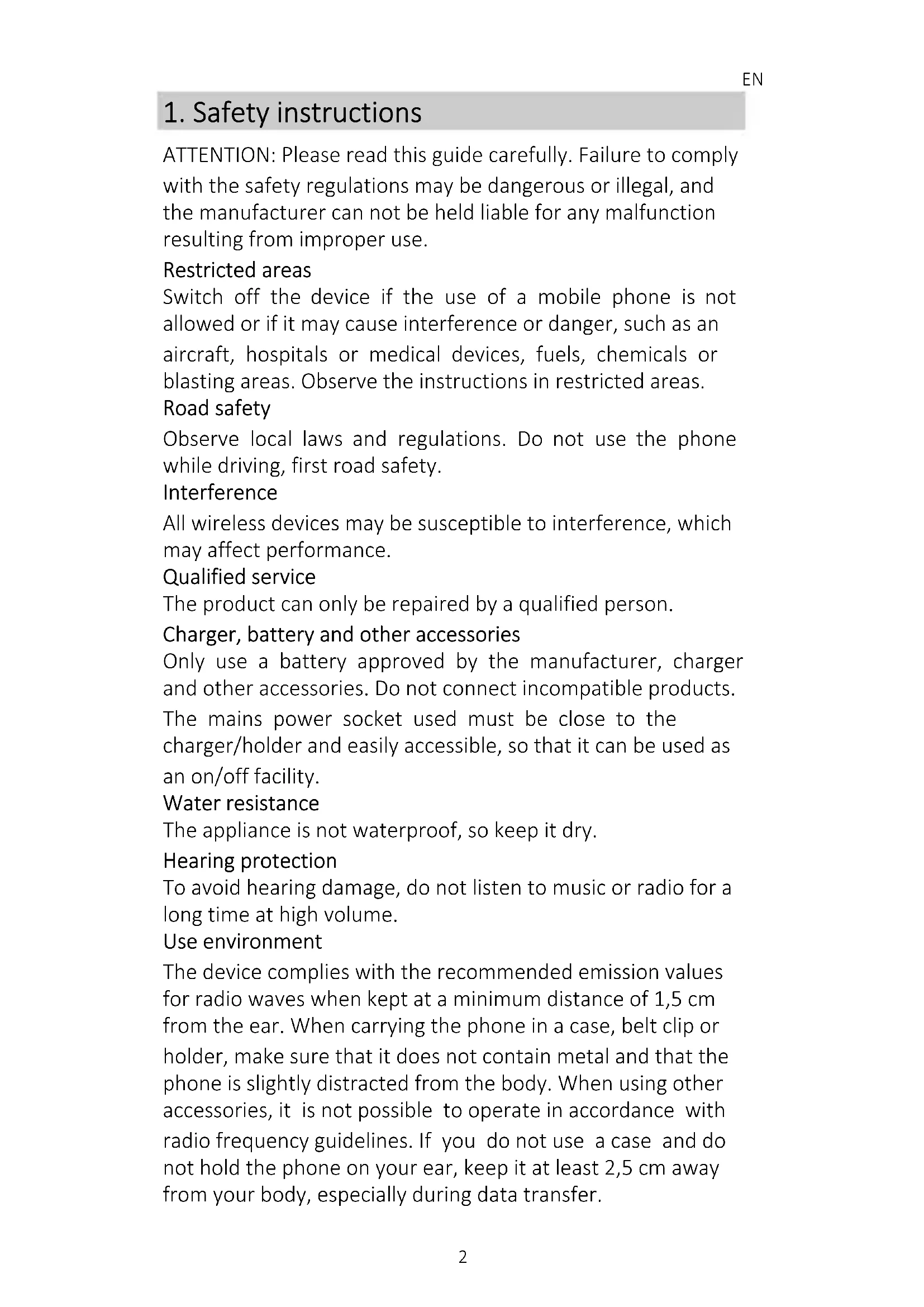 ATTENTION: Please read this guide carefully. Failure to comply with the safety regulations may be dangerous or illegal, and the manufacturer can not be held liable for any malfunction resulting from improper use. Restricted areas Switch off the device if the use of a mobile phone is not allowed or if it may cause interference or danger, such as an aircraft, hospitals or medical devices, fuels, chemicals or blasting areas. Observe the instructions in restricted areas. Road safety Observe local laws and regulations. Do not use the phone while driving, first road safety. Interference All wireless devices may be susceptible to interference, which may affect performance. Qualified service The product can only be repaired by a qualified person. Charger, battery and other accessories Only use a battery approved by the manufacturer, charger and other accessories. Do not connect incompatible products. The mains power socket used must be close to the charger/holder and easily accessible, so that it can be used as an on/off facility. Water resistance The appliance is not waterproof, so keep it dry. Hearing protection To avoid hearing damage, do not listen to music or radio for a long time at high volume. Use environment The device complies with the recommended emission values for radio waves when kept at a minimum distance of 1,5 cm from the ear. When carrying the phone in a case, belt clip or holder, make sure that it does not contain metal and that the phone is slightly distracted from the body. When using other accessories, it is not possible to operate in accordance with radio frequency guidelines. If you do not use a case and do not hold the phone on your ear, keep it at least 2,5 cm away from your body, especially during data transfer.EN