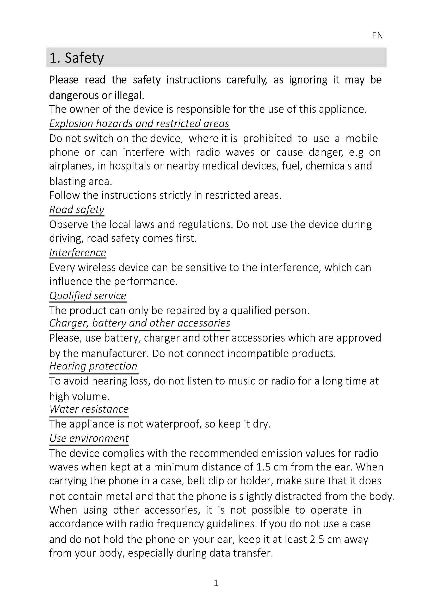 Please read the safety instructions carefully, as ignoring it may be dangerous or illegal. The owner of the device is responsible for the use of this appliance. Explosion hazards and restricted areas Do not switch on the device, where it is prohibited to use a mobile phone or can interfere with radio waves or cause danger, e.g on airplanes, in hospitals or nearby medical devices, fuel, chemicals and blasting area. Follow the instructions strictly in restricted areas. Road safety Observe the local laws and regulations. Do not use the device during driving, road safety comes first. Interference Every wireless device can be sensitive to the interference, which can influence the performance. Qualified service The product can only be repaired by a qualified person. Charger, battery and other accessories Please, use battery, charger and other accessories which are approved by the manufacturer. Do not connect incompatible products. Hearing protection To avoid hearing loss, do not listen to music or radio for a long time at high volume. Water resistance The appliance is not waterproof, so keep it dry. Use environment The device complies with the recommended emission values for radio waves when kept at a minimum distance of 1.5 cm from the ear. When carrying the phone in a case, belt clip or holder, make sure that it does not contain metal and that the phone is slightly distracted from the body. When using other accessories, it is not possible to operate in accordance with radio frequency guidelines. If you do not use a case and do not hold the phone on your ear, keep it at least 2.5 cm away from your body, especially during data transfer.EN