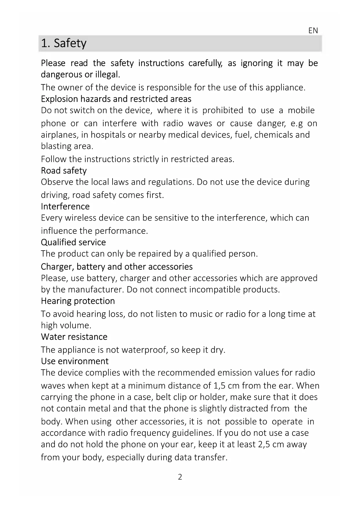 Please read the safety instructions carefully, as ignoring it may be dangerous or illegal. The owner of the device is responsible for the use of this appliance. Explosion hazards and restricted areas Do not switch on the device, where it is prohibited to use a mobile phone or can interfere with radio waves or cause danger, e.g on airplanes, in hospitals or nearby medical devices, fuel, chemicals and blasting area. Follow the instructions strictly in restricted areas. Road safety Observe the local laws and regulations. Do not use the device during driving, road safety comes first. Interference Every wireless device can be sensitive to the interference, which can influence the performance. Qualified service The product can only be repaired by a qualified person. Charger, battery and other accessories Please, use battery, charger and other accessories which are approved by the manufacturer. Do not connect incompatible products. Hearing protection To avoid hearing loss, do not listen to music or radio for a long time at high volume. Water resistance The appliance is not waterproof, so keep it dry. Use environment The device complies with the recommended emission values for radio waves when kept at a minimum distance of 1,5 cm from the ear. When carrying the phone in a case, belt clip or holder, make sure that it does not contain metal and that the phone is slightly distracted from the body. When using other accessories, it is not possible to operate in accordance with radio frequency guidelines. If you do not use a case and do not hold the phone on your ear, keep it at least 2,5 cm away from your body, especially during data transfer.EN