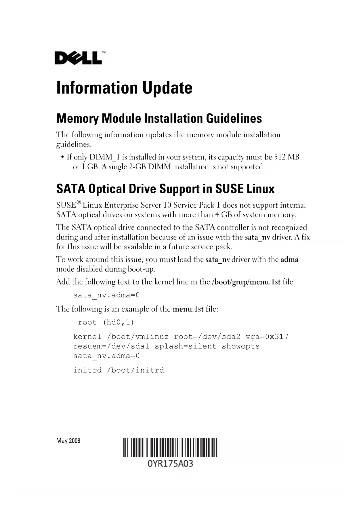 - If only DIMM_1 is installed in your system, its capacity must be 512 MB or 1 GB. A single 2-GB DIMM installation is not supported. SATA Optical Drive Support in SUSE Linux SUSE