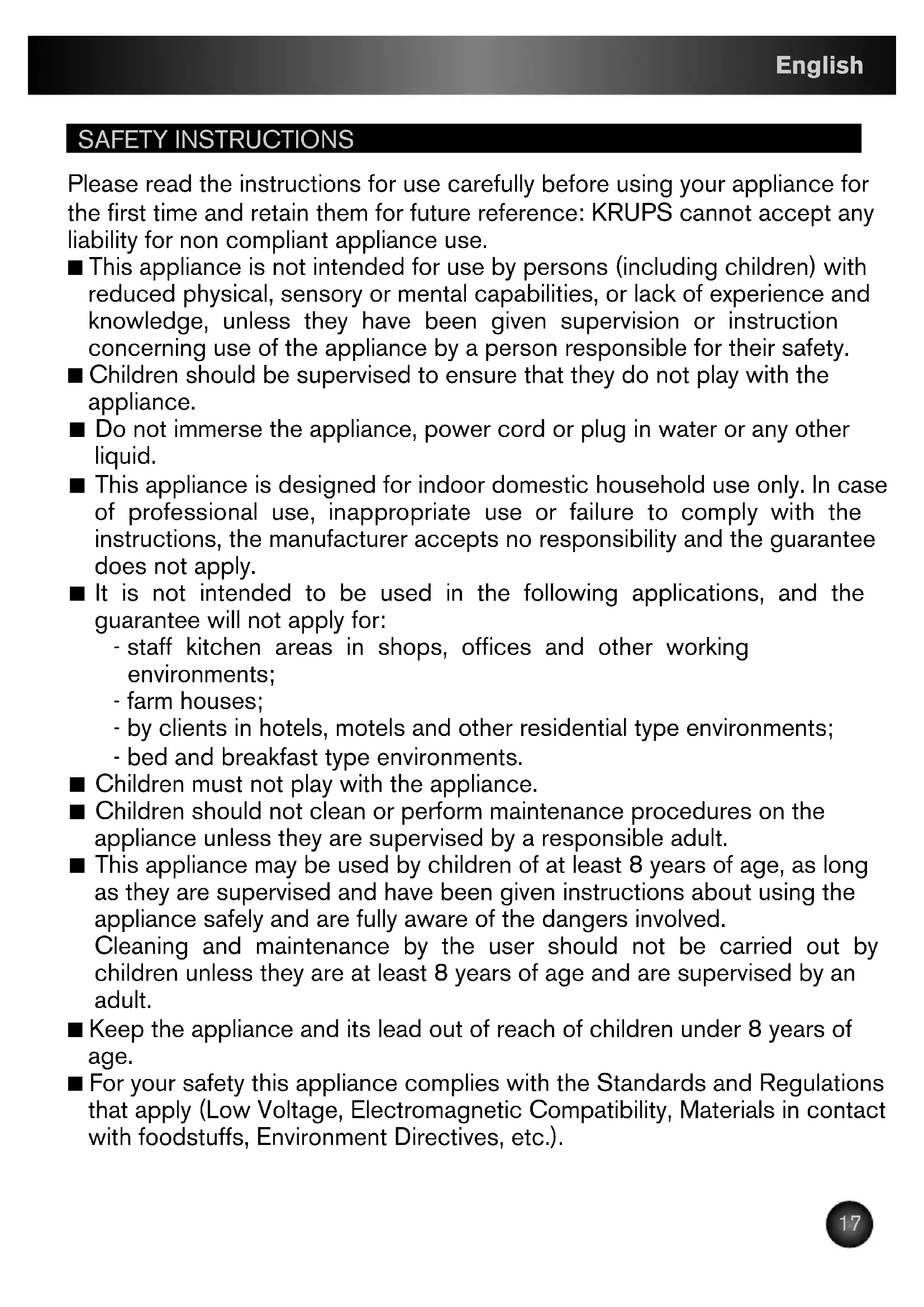 KR_CAFETIERE_CAFE-ET-LATTE_NC00120110_Miseenpage119/06/1315:05Page16SAFETY INSTRUCTIONS Please read the instructions for use carefully before using your appliance for the first time and retain them for future reference: KRUPS cannot accept any liability for non compliant appliance use. ■ This appliance is not intended for use by persons (including children) with reduced physical, sensory or mental capabilities, or lack of experience and knowledge, unless they have been given supervision or instruction concerning use of the appliance by a person responsible for their safety. ■ Children should be supervised to ensure that they do not play with the appliance. ■ Do not immerse the appliance, power cord or plug in water or any other liquid. ■ This appliance is designed for indoor domestic household use only. In case of professional use, inappropriate use or failure to comply with the instructions, the manufacturer accepts no responsibility and the guarantee does not apply. ■ It is not intended to be used in the following applications, and the guarantee will not apply for: - staff kitchen areas in shops, offices and other working environments; - farm houses; - by clients in hotels, motels and other residential type environments; - bed and breakfast type environments. ■ Children must not play with the appliance. ■ Children should not clean or perform maintenance procedures on the appliance unless they are supervised by a responsible adult. ■ This appliance may be used by children of at least 8 years of age, as long as they are supervised and have been given instructions about using the appliance safely and are fully aware of the dangers involved. Cleaning and maintenance by the user should not be carried out by children unless they are at least 8 years of age and are supervised by an adult. ■ Keep the appliance and its lead out of reach of children under 8 years of age. ■ For your safety this appliance complies with the Standards and Regulations that apply (Low Voltage, Electromagnetic Compatibility, Materials in contact with foodstuffs, Environment Directives, etc.). English