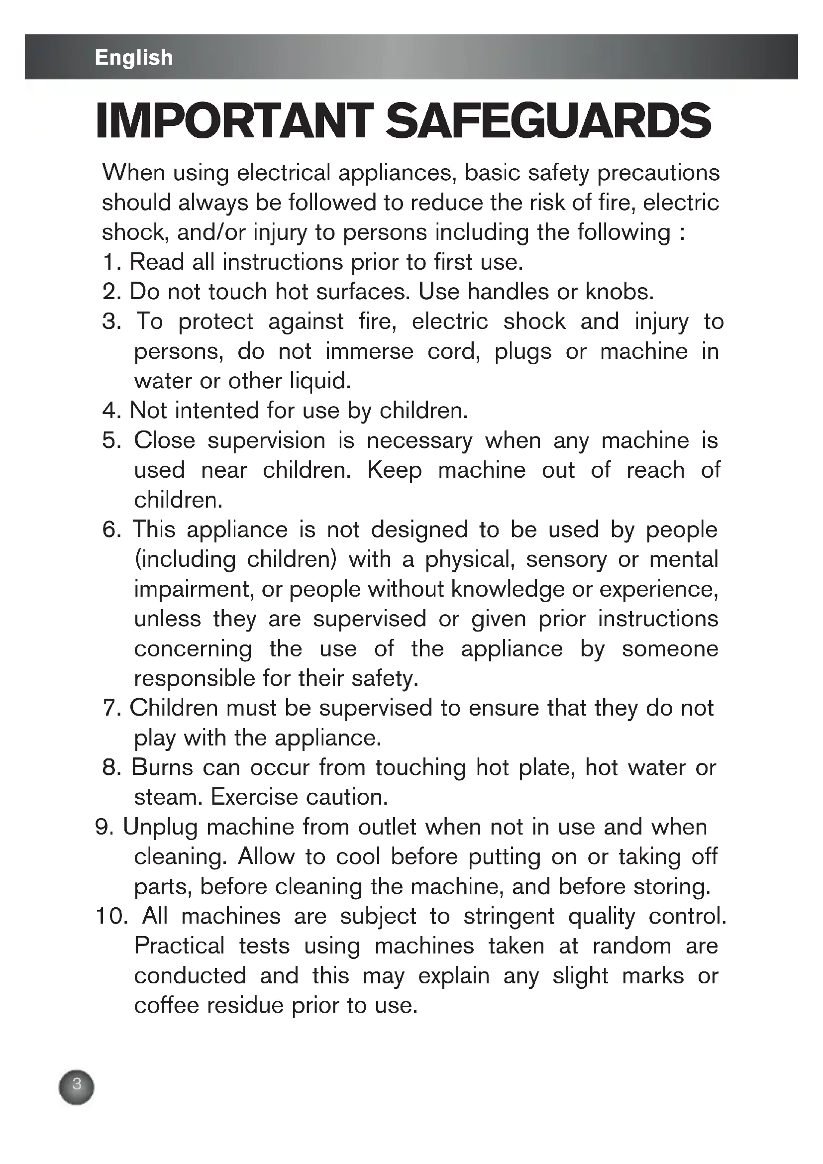 IMPORTANT SAFEGUARDS When using electrical appliances, basic safety precautions should always be followed to reduce the risk of fire, electric shock, and/or injury to persons including the following :