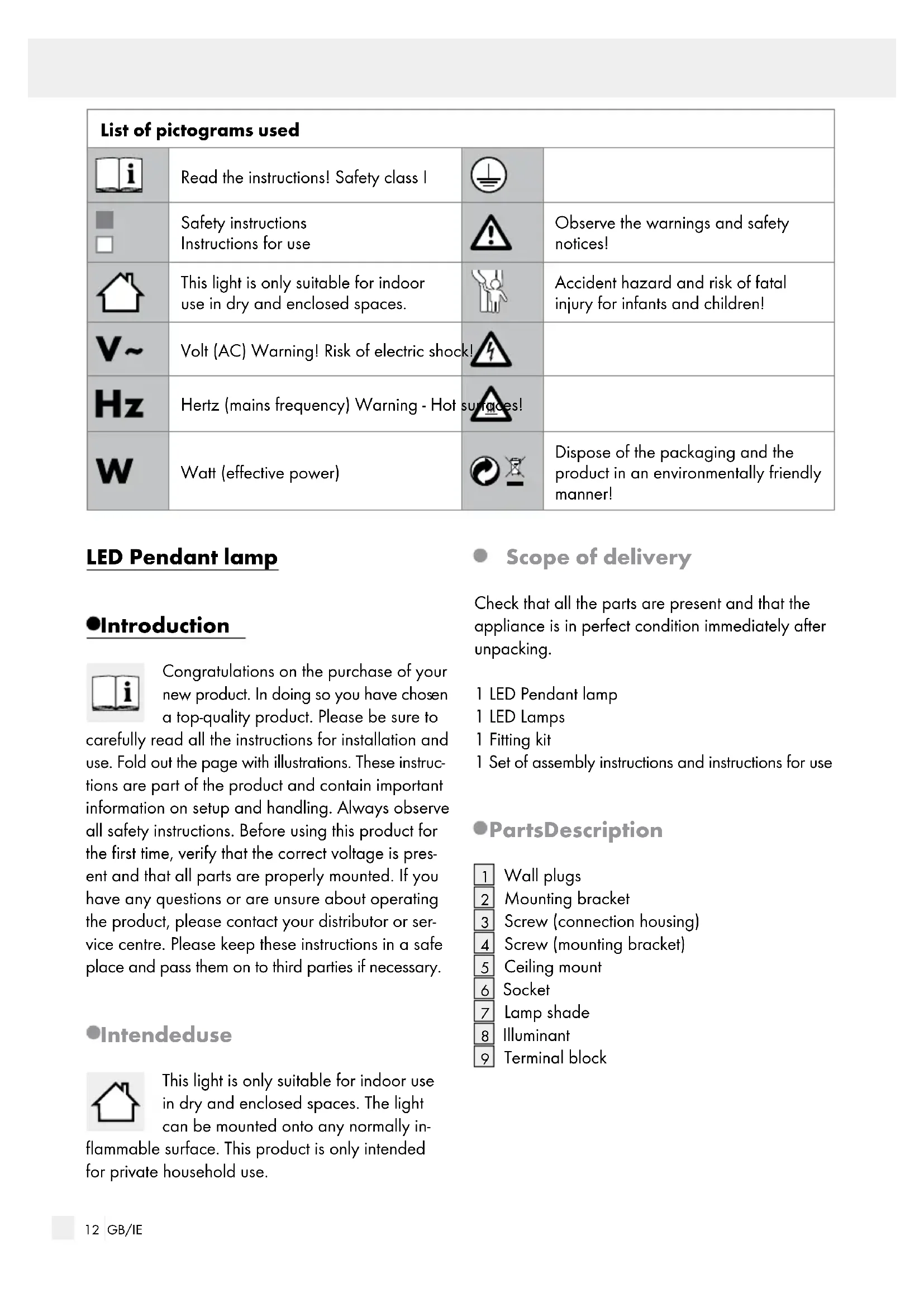 a top-quality product. Please be sure to carefully read all the instructions for installation and use. Fold out the page with illustrations. These instruc- tions are part of the product and contain important information on setup and handling. Always observe all safety instructions. Before using this product for the first time, verify that the correct voltage is pres- ent and that all parts are properly mounted. If you have any questions or are unsure about operating the product, please contact your distributor or ser- vice centre. Please keep these instructions in a safe place and pass them on to third parties if necessary. Intended use This light is only suitable for indoor use in dry and enclosed spaces. The light can be mounted onto any normally in- flammable surface. This product is only intended for private household use. Scope of delivery Check that all the parts are present and that the appliance is in perfect condition immediately after unpacking. 1 LED Pendant lamp 1 LED Lamps 1 Fitting kit 1 Set of assembly instructions and instructions for use Parts Description