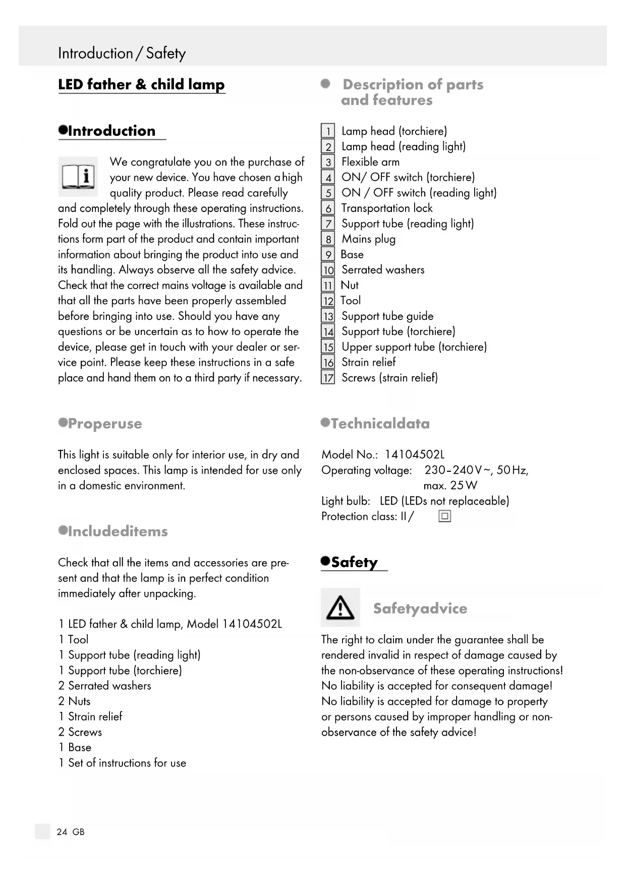 Screws (strain relief) Technical data Model No.: 14104502L Operating voltage: 230–240 V ∼, 50 Hz, max. 25 W Light bulb: LED (LEDs not replaceable) Protection class: II / Safety Safety advice The right to claim under the guarantee shall be rendered invalid in respect of damage caused by the non-observance of these operating instructions! No liability is accepted for consequent damage! No liability is accepted for damage to property or persons caused by improper handling or non- observance of the safety advice!25 GB Safety / Preparing the product for use To avoid danger to life from electric shock Every time before connecting the lamp the mains, check it and the mains lead for damage. Never use your light if you find it is damaged in any way. CAUTION! A damaged light bulb means your life is at risk from electric shock. If there is any damage, repairs to be carried out or other problems related to the light bulb, please contact the service centre or a qualified electrician. In order to prevent hazards, if the outer flexible cable of this lamp becomes damaged it may only be replaced by the manufacturer, a service representative of the manufacturer or a similar specialist! Before assembly, ensure that the mains voltage available corresponds to the operating voltage necessary of the light (230–240 V ∼). Never let the lamp come into contact with water or other liquids. Always unplug the light from the mains prior to assembly, disassembly, cleaning or if the light will not be used for extended periods. Never open or insert anything into electrical fittings or equipment. Doing this sort of thing can lead to a serious danger to life from electric shock. To avoid danger of fire and injury CAUTION! RISK OF INJURY! Check bulbs for damage immediately after unpacking. Do not fit defective bulbs into the light. If they are, contact the service point for a replacement.