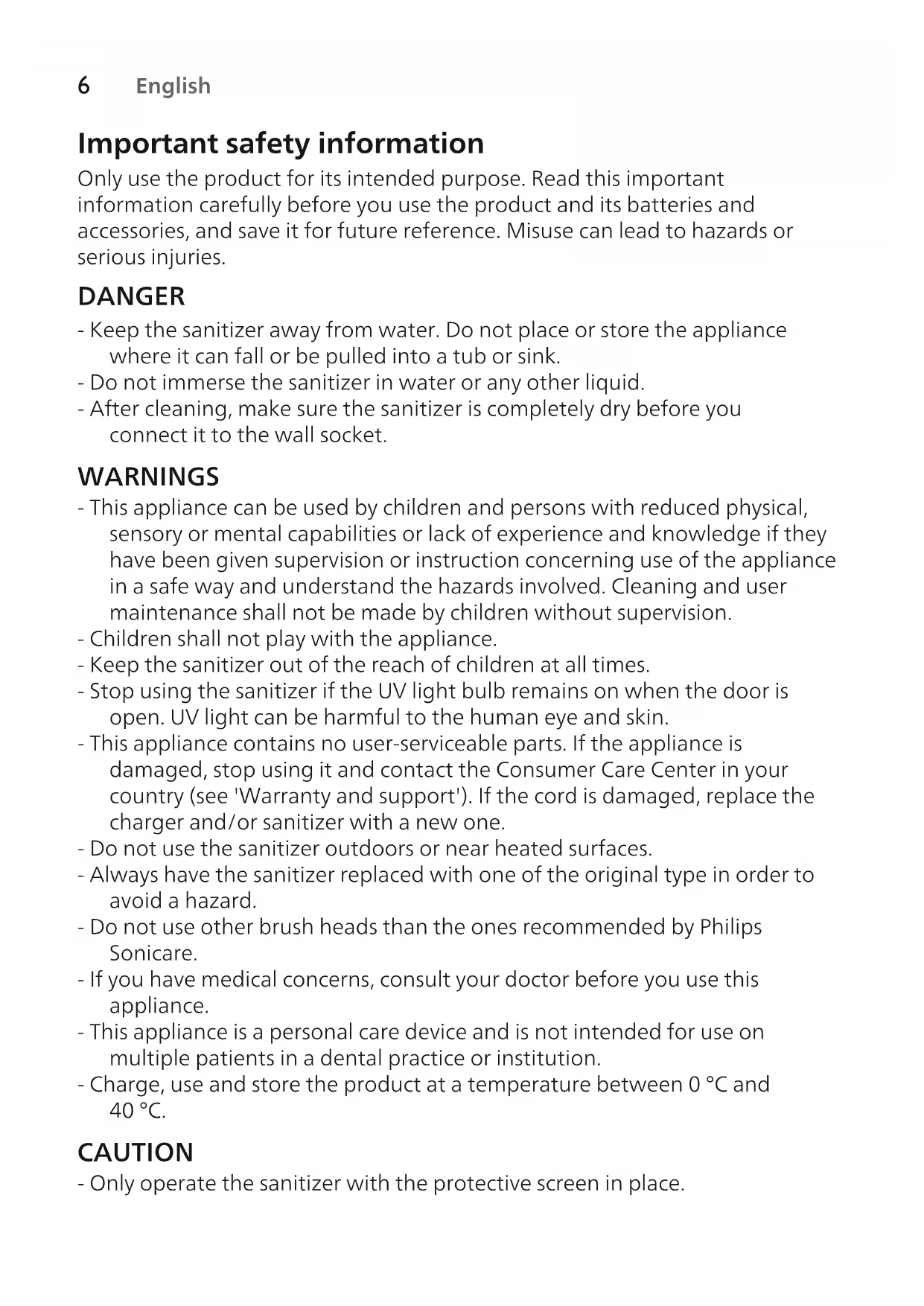 English Important safety information Only use the product for its intended purpose. Read this important information carefully before you use the product and its batteries and accessories, and save it for future reference. Misuse can lead to hazards or serious injuries. DANGER - Keep the sanitizer away from water. Do not place or store the appliance where it can fall or be pulled into a tub or sink. - Do not immerse the sanitizer in water or any other liquid. - After cleaning, make sure the sanitizer is completely dry before you connect it to the wall socket. WARNINGS - This appliance can be used by children and persons with reduced physical, sensory or mental capabilities or lack of experience and knowledge if they have been given supervision or instruction concerning use of the appliance in a safe way and understand the hazards involved. Cleaning and user maintenance shall not be made by children without supervision. - Children shall not play with the appliance. - Keep the sanitizer out of the reach of children at all times. - Stop using the sanitizer if the UV light bulb remains on when the door is open. UV light can be harmful to the human eye and skin. - This appliance contains no user-serviceable parts. If the appliance is damaged, stop using it and contact the Consumer Care Center in your country (see 'Warranty and support'). If the cord is damaged, replace the charger and/or sanitizer with a new one. - Do not use the sanitizer outdoors or near heated surfaces. - Always have the sanitizer replaced with one of the original type in order to avoid a hazard. - Do not use other brush heads than the ones recommended by Philips Sonicare. - If you have medical concerns, consult your doctor before you use this appliance. - This appliance is a personal care device and is not intended for use on multiple patients in a dental practice or institution. - Charge, use and store the product at a temperature between 0°C and 40°C. CAUTION - Only operate the sanitizer with the protective screen in place.7 English - The UV light bulb of the sanitizer is hot during and immediately after the sanitizing cycle. Do not touch the UV light bulb when it is hot. - If you have used the sanitizer for 3 UV clean cycles in a row, switch it off for at least 30 minutes before you start another UV clean cycle. - Do not clean any part of the product in the dishwasher. Electromagnetic fields (EMF) This Philips appliance complies with all applicable standards and regulations regarding exposure to electromagnetic fields. Introduction Congratulations on your purchase and welcome to Philips! To fully benefit from the support that Philips offers, register your product at www.philips.com/welcome. General Description (Fig. 1) 1 On/off button 2 Door recess 3 Window 4 Sonicare power toothbrush charger 5 Cord Sanitizing your brush heads With the UV sanitizer you can clean your brush head after every use. Note: UV light can be harmful to the human eye and skin.