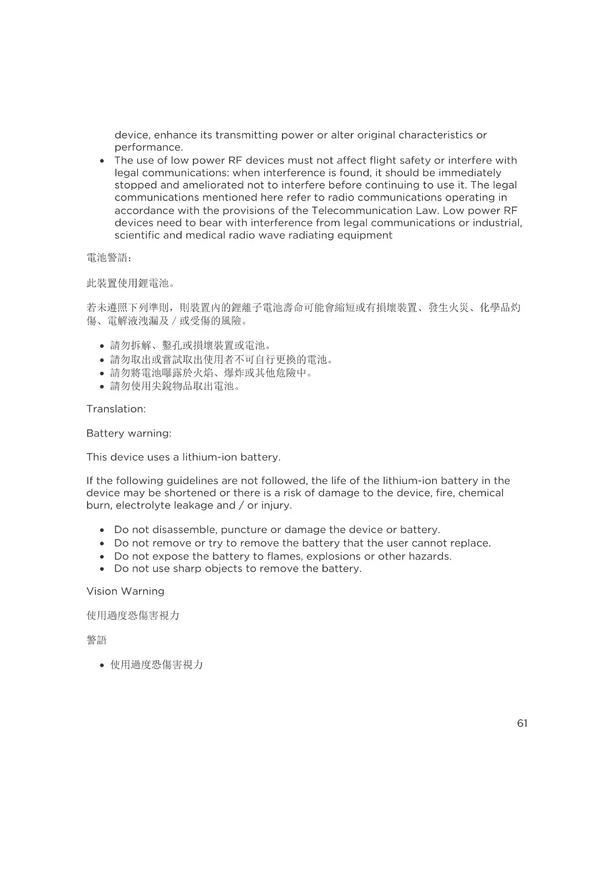 - 請勿使用尖銳物品取出電池。 Translation: Battery warning: This device uses a lithium-ion battery. If the following guidelines are not followed, the life of the lithium-ion battery in the device may be shortened or there is a risk of damage to the device, fire, chemical burn, electrolyte leakage and / or injury.