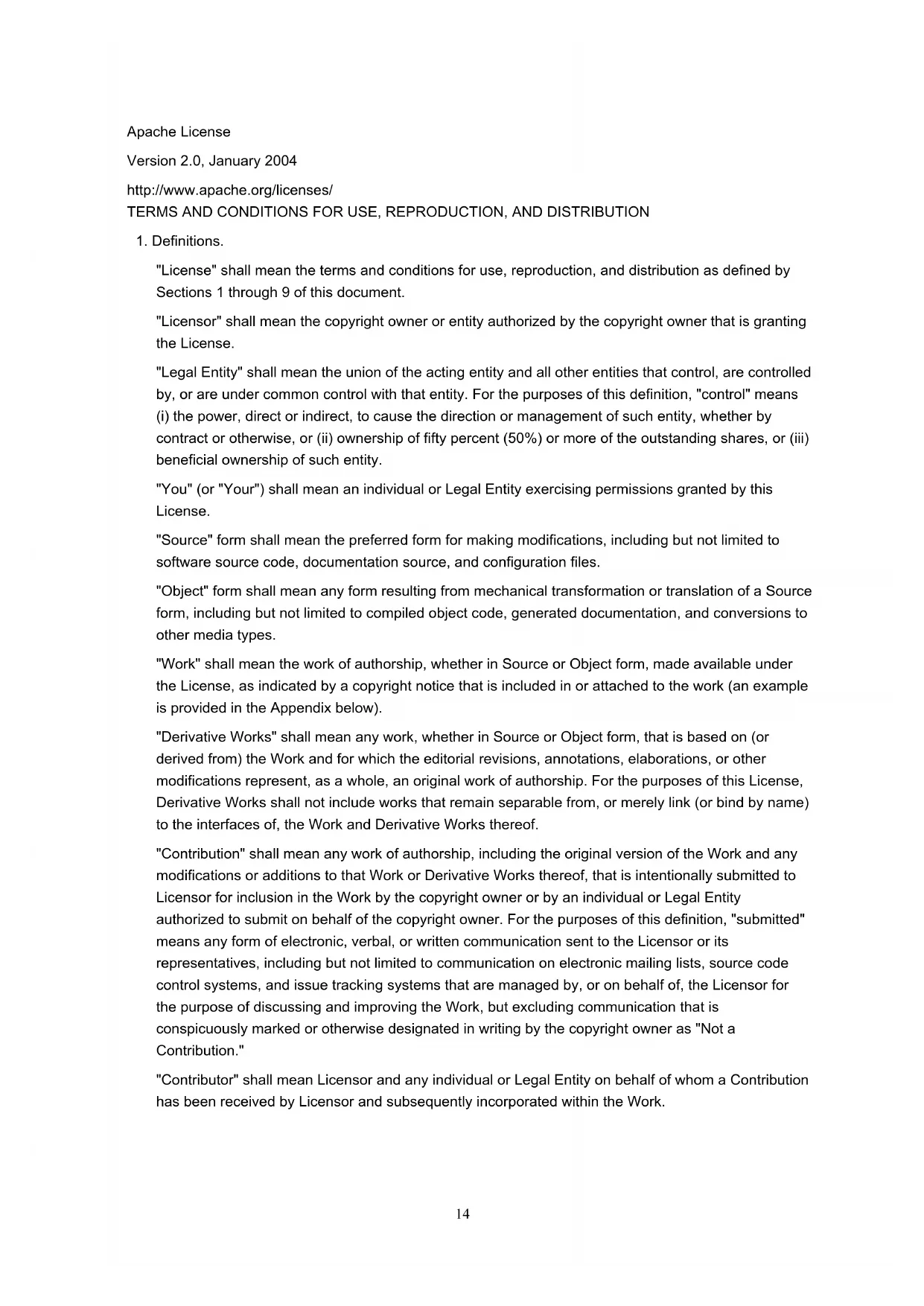 promote products derived from this software without specific prior written permission. THIS SOFTWARE IS PROVIDED BY APPLE AND ITS CONTRIBUTORS "AS IS" AND ANY EXPRESS OR IMPLIED WARRANTIES, INCLUDING, BUT NOT LIMITED TO, THE IMPLIED WARRANTIES OF MERCHANTABILITY AND FITNESS FOR A PARTICULAR PURPOSE ARE DISCLAIMED. IN NO EVENT SHALL APPLE OR ITS CONTRIBUTORS BE LIABLE FOR ANY DIRECT, INDIRECT, INCIDENTAL, SPECIAL, EXEMPLARY, OR CONSEQUENTIAL DAMAGES (INCLUDING, BUT NOT LIMITED TO, PROCUREMENT OF SUBSTITUTE GOODS OR SERVICES; LOSS OF USE, DATA, OR PROFITS; OR BUSINESS INTERRUPTION) HOWEVER CAUSED AND ON ANY THEORY OF LIABILITY, WHETHER IN CONTRACT, STRICT LIABILITY, OR TORT (INCLUDING NEGLIGENCE OR OTHERWISE) ARISING IN ANY WAY OUT OF THE USE OF THIS SOFTWARE, EVEN IF ADVISED OF THE POSSIBILITY OF SUCH DAMAGE. 13Apache License Version 2.0, January 2004 http://www.apache.org/licenses/ TERMS AND CONDITIONS FOR USE, REPRODUCTION, AND DISTRIBUTION