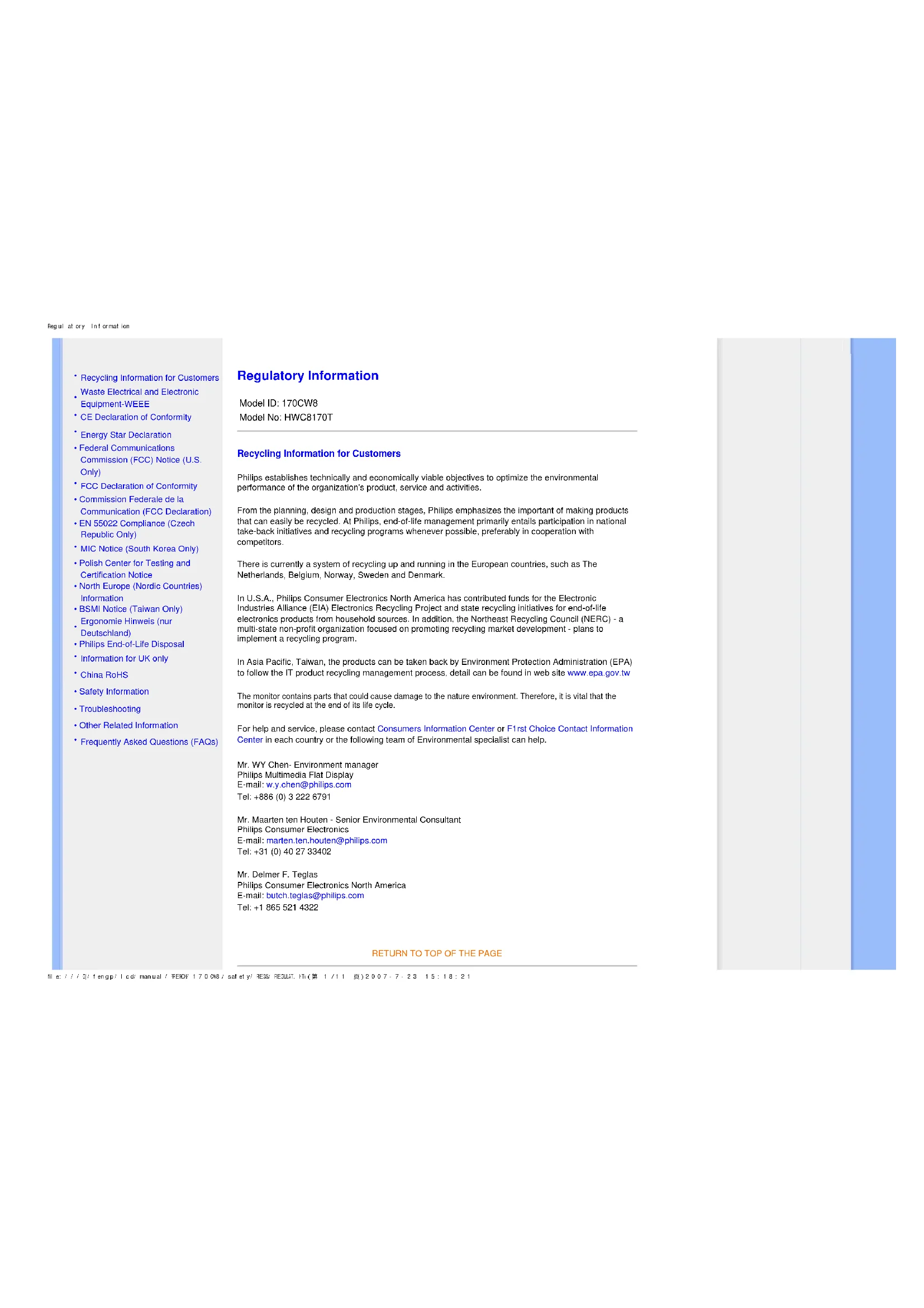 Frequently Asked Questions (FAQs) Regulatory Information Model ID: 170CW8 Model No: HWC8170T Recycling Information for Customers Philips establishes technically and economically viable objectives to optimize the environmental performance of the organization's product, service and activities. From the planning, design and production stages, Philips emphasizes the important of making products that can easily be recycled. At Philips, end-of-life management primarily entails participation in national take-back initiatives and recycling programs whenever possible, preferably in cooperation with competitors. There is currently a system of recycling up and running in the European countries, such as The Netherlands, Belgium, Norway, Sweden and Denmark. In U.S.A., Philips Consumer Electronics North America has contributed funds for the Electronic Industries Alliance (EIA) Electronics Recycling Project and state recycling initiatives for end-of-life electronics products from household sources. In addition, the Northeast Recycling Council (NERC) - a multi-state non-profit organization focused on promoting recycling market development - plans to implement a recycling program. In Asia Pacific, Taiwan, the products can be taken back by Environment Protection Administration (EPA) to follow the IT product recycling management process, detail can be found in web site www.epa.gov.tw The monitor contains parts that could cause damage to the nature environment. Therefore, it is vital that the monitor is recycled at the end of its life cycle. For help and service, please contact Consumers Information Center or F1rst Choice Contact Information Center in each country or the following team of Environmental specialist can help. Mr. WY Chen- Environment manager Philips Multimedia Flat Display E-mail: w.y.chen@philips.com Tel: +886 (0) 3 222 6791 Mr. Maarten ten Houten - Senior Environmental Consultant Philips Consumer Electronics E-mail: marten.ten.houten@philips.com Tel: +31 (0) 40 27 33402 Mr. Delmer F. Teglas Philips Consumer Electronics North America E-mail: butch.teglas@philips.com Tel: +1 865 521 4322