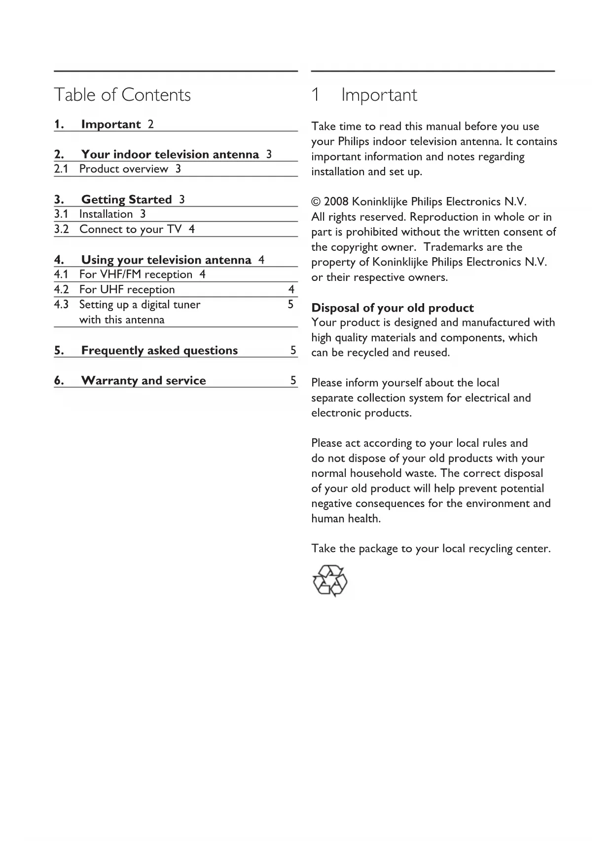 1 Important Take time to read this manual before you use your Philips indoor television antenna. It contains important information and notes regarding installation and set up. © 2008 Koninklijke Philips Electronics N.V. All rights reserved. Reproduction in whole or in part is prohibited without the written consent of the copyright owner. Trademarks are the property of Koninklijke Philips Electronics N.V. or their respective owners. Disposal of your old product Your product is designed and manufactured with high quality materials and components, which can be recycled and reused. Please inform yourself about the local separate collection system for electrical and electronic products. Please act according to your local rules and do not dispose of your old products with your normal household waste. The correct disposal of your old product will help prevent potential negative consequences for the environment and human health. Take the package to your local recycling center.3 2 Your indoor television antenna Congratulations on your purchase and welcome to Philips! To fully benet from the support that Philips offers, register your product at www.philips.com/welcome.