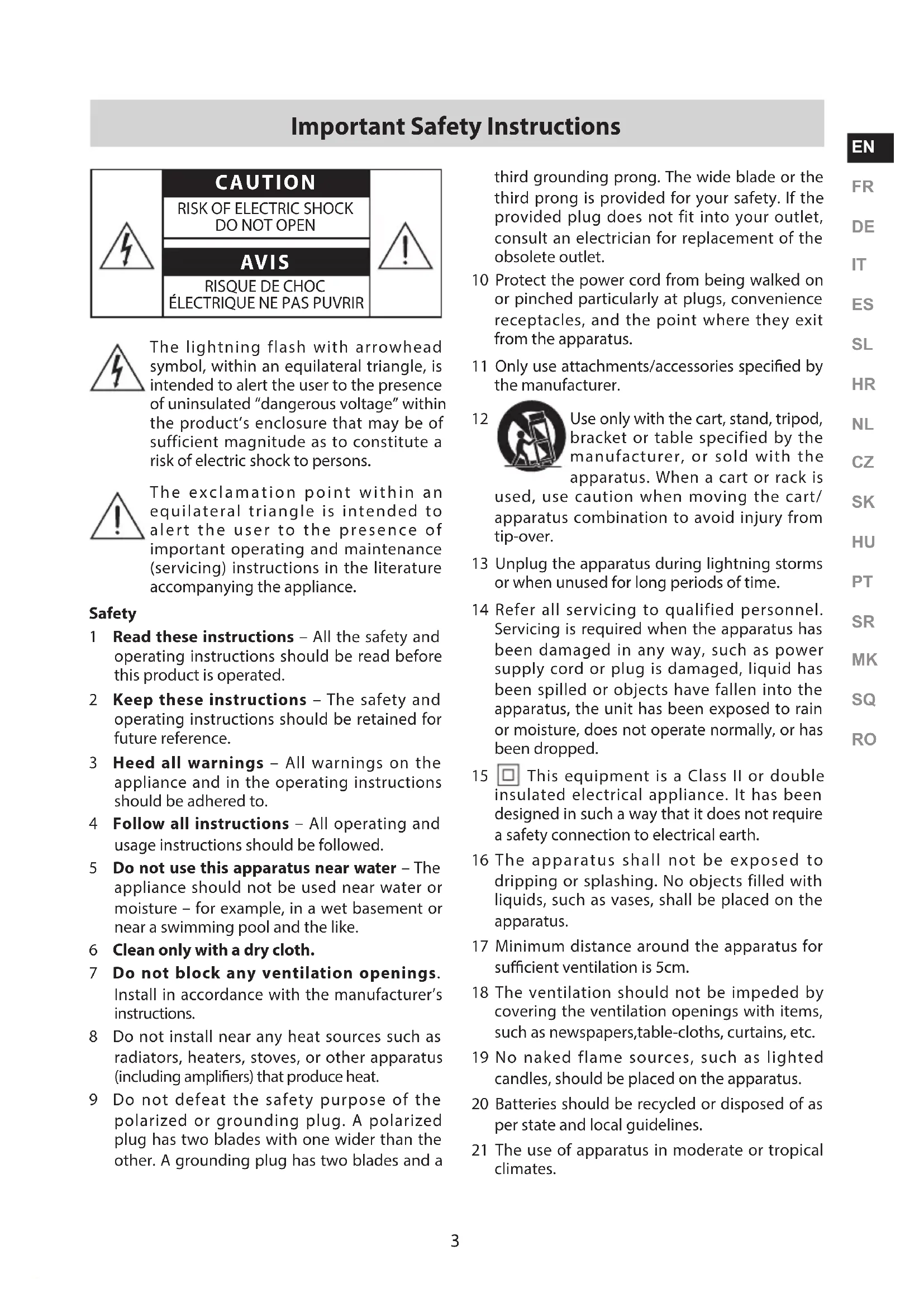 This equipment is a Class II or double insulated electrical appliance. It has been designed in such a way that it does not require a safety connection to electrical earth. 16 The apparatus shall not be exposed to dripping or splashing. No objects filled with liquids, such as vases, shall be placed on the apparatus. 17 Minimum distance around the apparatus for sucient ventilation is 5cm. 18 The ventilation should not be impeded by covering the ventilation openings with items, such as newspapers,table-cloths, curtains, etc. 19 No naked flame sources, such as lighted candles, should be placed on the apparatus. 20 Batteries should be recycled or disposed of as per state and local guidelines. 21 The use of apparatus in moderate or tropical climates. Important Safety Instructions The lightning flash with arrowhead symbol, within an equilateral triangle, is intended to alert the user to the presence of uninsulated “dangerous voltage” within the product’s enclosure that may be of sufficient magnitude as to constitute a risk of electric shock to persons. The exclamation point within an equilateral triangle is intended to alert the user to the presence of important operating and maintenance (servicing) instructions in the literature accompanying the appliance. Safety 1 Read these instructions – All the safety and operating instructions should be read before this product is operated. 2 Keep these instructions – The safety and operating instructions should be retained for future reference. 3 Heed all warnings – All warnings on the appliance and in the operating instructions should be adhered to. 4 Follow all instructions – All operating and usage instructions should be followed. 5 Do not use this apparatus near water – The appliance should not be used near water or moisture – for example, in a wet basement or near a swimming pool and the like. 6 Clean only with a dry cloth. 7 Do not block any ventilation openings. Install in accordance with the manufacturer’s instructions. 8 Do not install near any heat sources such as radiators, heaters, stoves, or other apparatus (including ampliers) that produce heat. 9 Do not defeat the safety purpose of the polarized or grounding plug. A polarized plug has two blades with one wider than the other. A grounding plug has two blades and a CAUTION