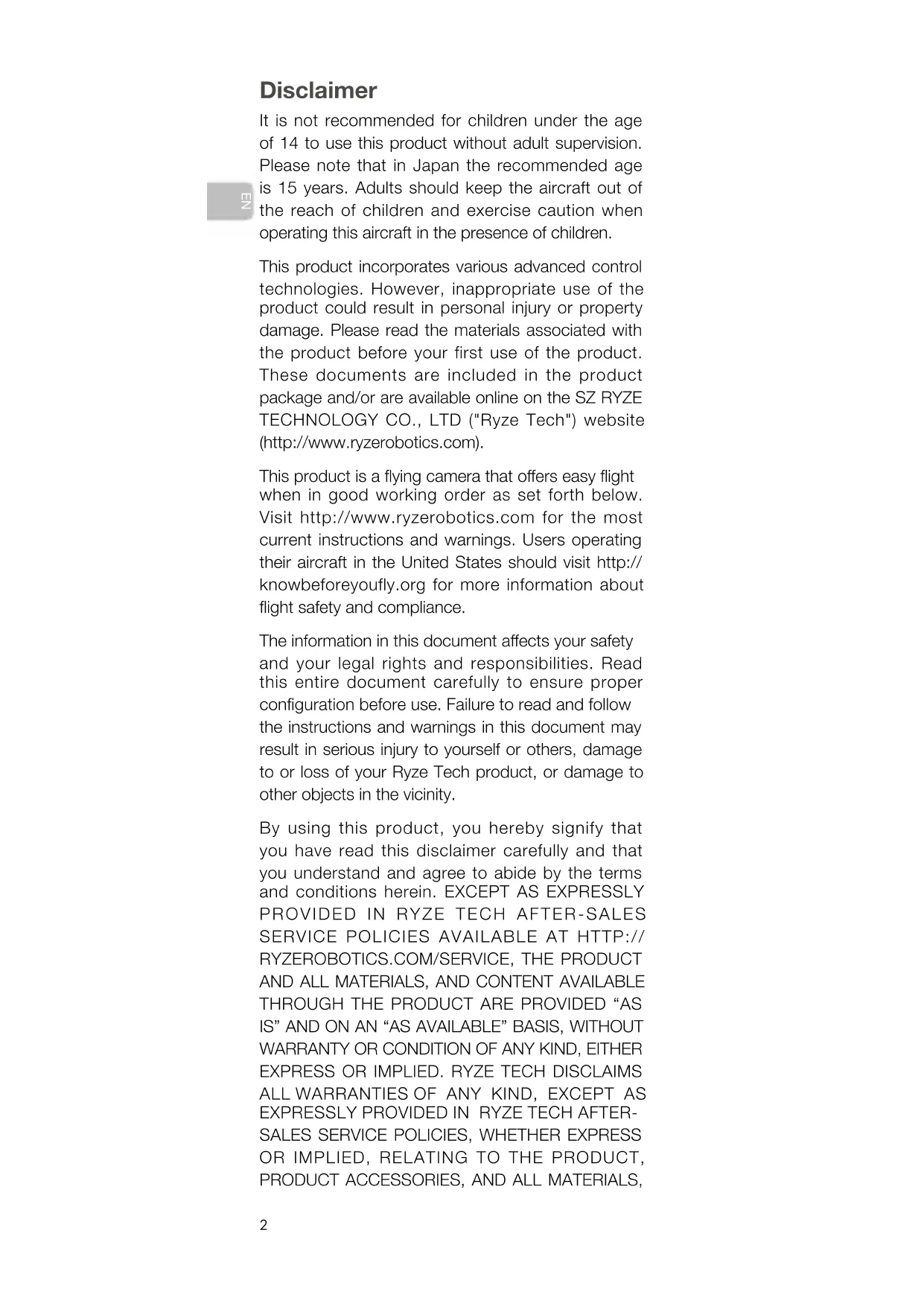 Disclaimer It is not recommended for children under the age of 14 to use this product without adult supervision. Please note that in Japan the recommended age is 15 years. Adults should keep the aircraft out of the reach of children and exercise caution when operating this aircraft in the presence of children. This product incorporates various advanced control technologies. However, inappropriate use of the product could result in personal injury or property damage. Please read the materials associated with the product before your first use of the product. These documents are included in the product package and/or are available online on the SZ RYZE TECHNOLOGY CO., LTD ("Ryze Tech") website (http://www.ryzerobotics.com). This product is a ying camera that oers easy ight when in good working order as set forth below. Visit http://www.ryzerobotics.com for the most current instructions and warnings. Users operating their aircraft in the United States should visit http:// knowbeforeyoufly.org for more information about ight safety and compliance. The information in this document aects your safety and your legal rights and responsibilities. Read this entire document carefully to ensure proper conguration before use. Failure to read and follow the instructions and warnings in this document may result in serious injury to yourself or others, damage to or loss of your Ryze Tech product, or damage to other objects in the vicinity. By using this product, you hereby signify that you have read this disclaimer carefully and that you understand and agree to abide by the terms and conditions herein. EXCEPT AS EXPRESSLY