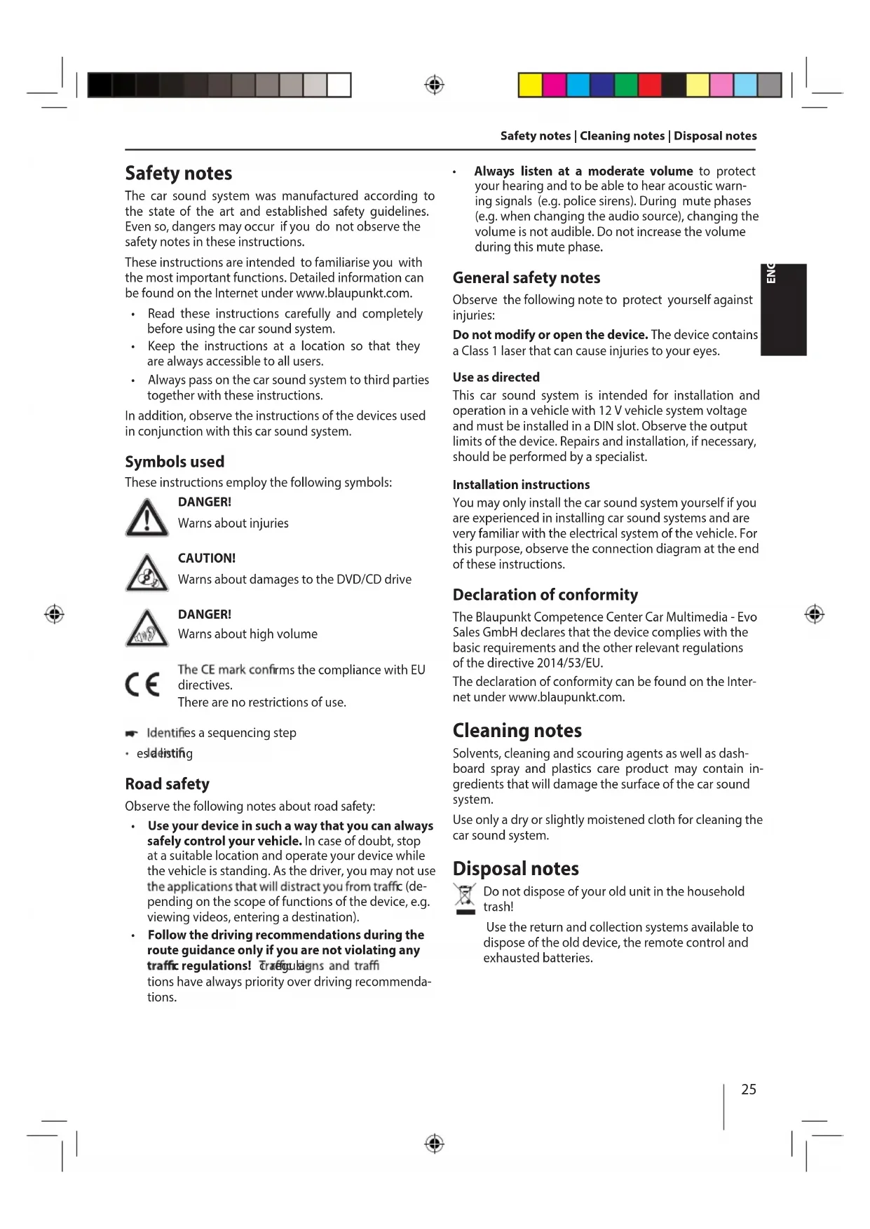 - Always listen at a moderate volume to protect your hearing and to be able to hear acoustic warn- ing signals (e.g. police sirens). During mute phases (e.g. when changing the audio source), changing the volume is not audible. Do not increase the volume during this mute phase. General safety notes Observe the following note to protect yourself against injuries: Do not modify or open the device. The device contains a Class 1 laser that can cause injuries to your eyes. Use as directed This car sound system is intended for installation and operation in a vehicle with 12 V vehicle system voltage and must be installed in a DIN slot. Observe the output limits of the device. Repairs and installation, if necessary, should be performed by a specialist. Installation instructions You may only install the car sound system yourself if you are experienced in installing car sound systems and are very familiar with the electrical system of the vehicle. For this purpose, observe the connection diagram at the end of these instructions. Declaration of conformity The declaration of conformity can be found on the Inter- net under www.blaupunkt.com. Cleaning notes Solvents, cleaning and scouring agents as well as dash- board spray and plastics care product may contain in- gredients that will damage the surface of the car sound system. Use only a dry or slightly moistened cloth for cleaning the car sound system. Disposal notes Do not dispose of your old unit in the household trash! Use the return and collection systems available to dispose of the old device, the remote control and exhausted batteries. The Blaupunkt Competence Center Car Multimedia - Evo Sales GmbH declares that the device complies with the basic requirements and the other relevant regulations of the directive 2014/53/EU.26 Scope of delivery The scope of delivery includes: