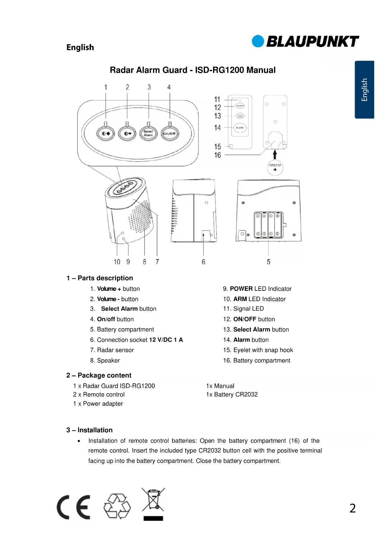 2 – Package content 1 x Radar Guard ISD-RG1200 2 x Remote control 1 x Power adapter 1x Manual 1x Battery CR2032 3 – Installation