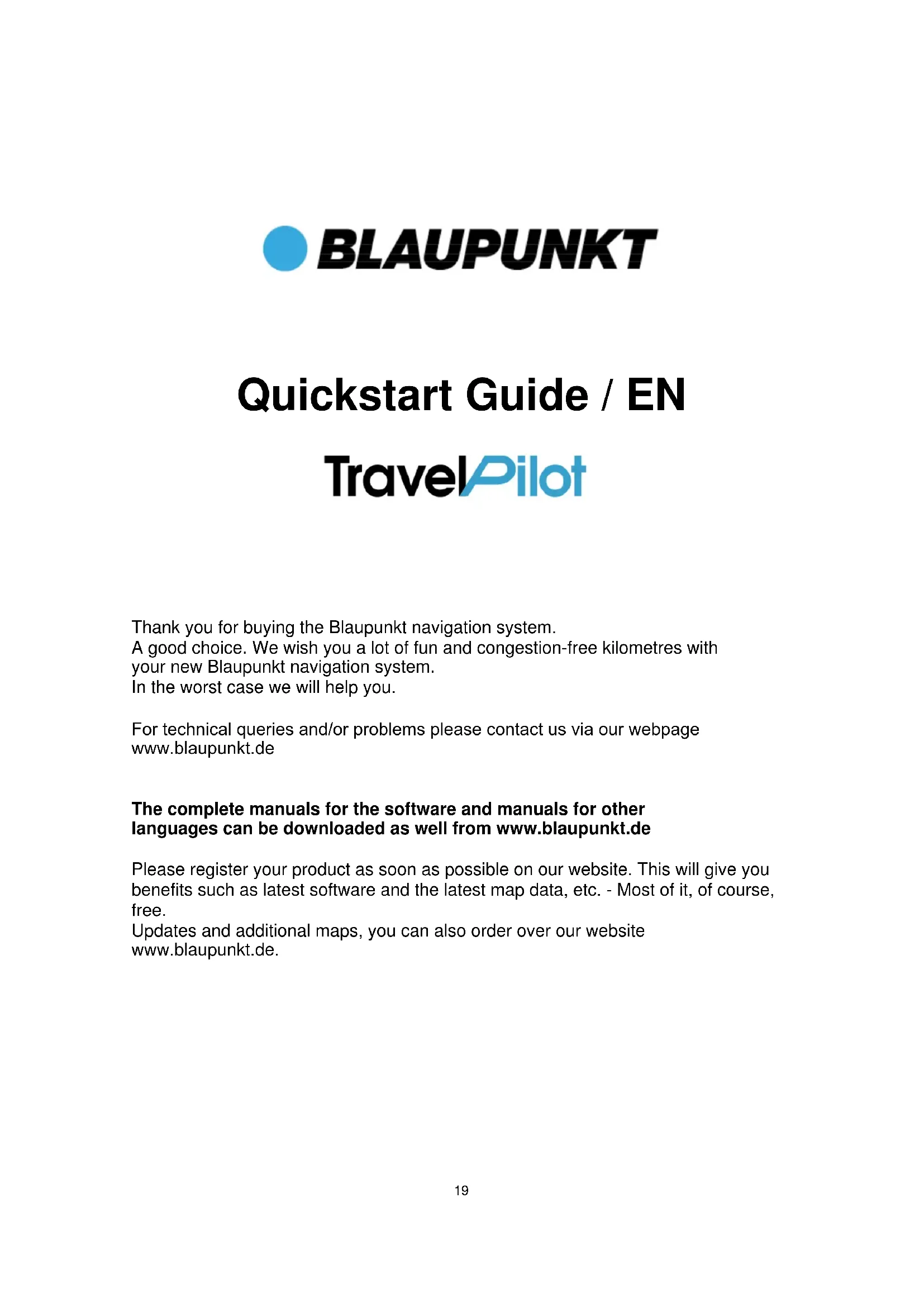 The complete manuals for the software and manuals for other languages can be downloaded as well from www.blaupunkt.de Please register your product as soon as possible on our website. This will give you benefits such as latest software and the latest map data, etc. - Most of it, of course, free. Updates and additional maps, you can also order over our website www.blaupunkt.de.20 Dear Customer, Thanks for using a naviga tion system of Blaupunkt.