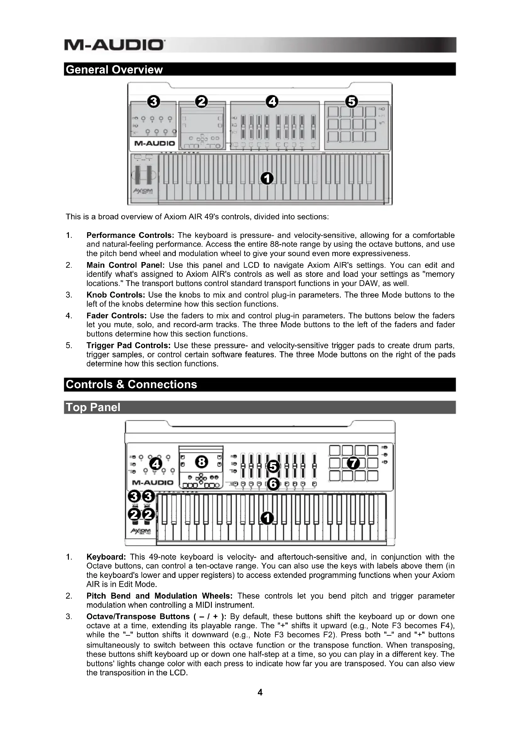 trigger samples, or control certain software features. The three Mode buttons on the right of the pads determine how this section functions. Controls & Connections Top Panel