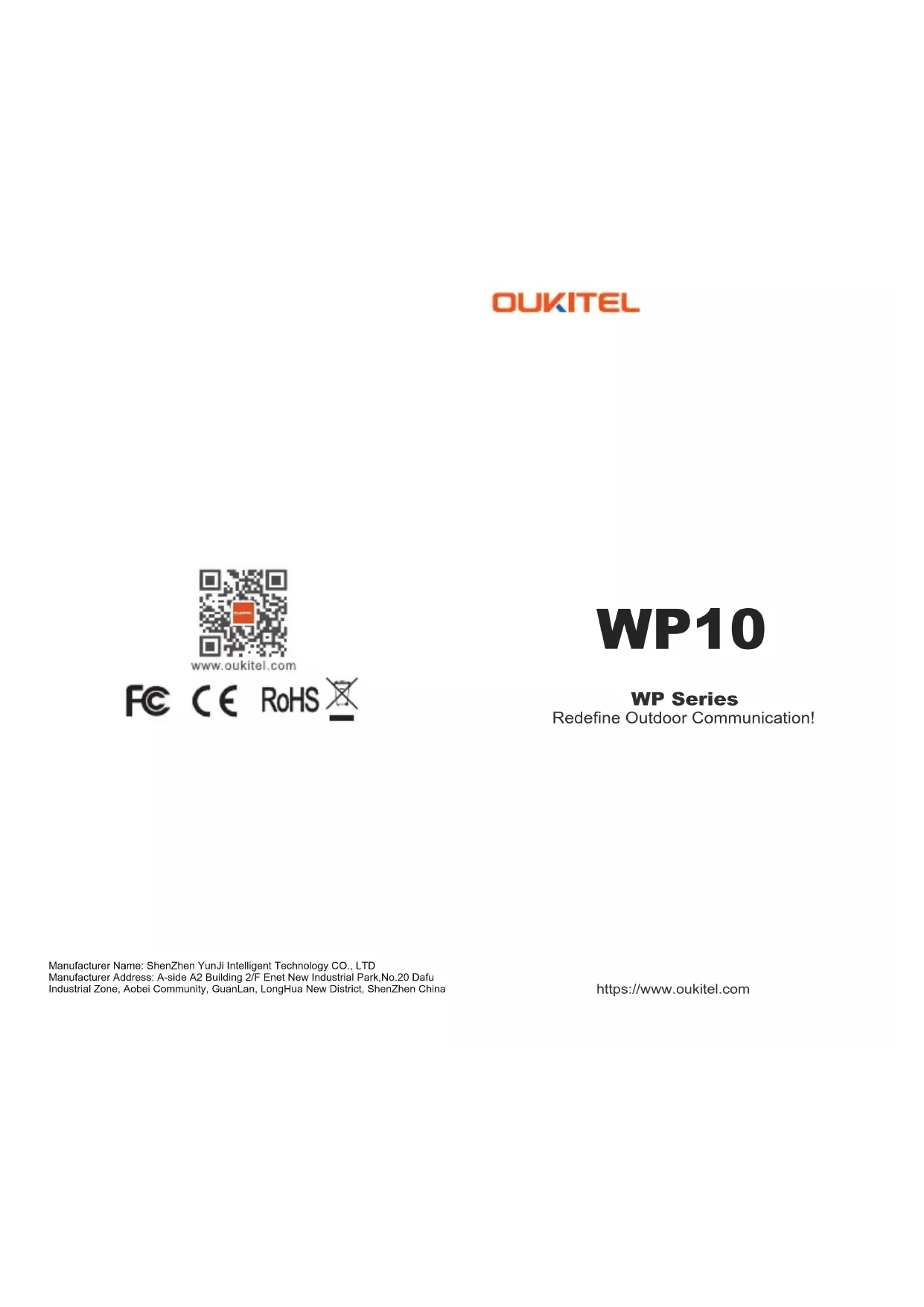 WP10 WP Series Redefine Outdoor Communication! https://www.oukitel.com Manufacturer Name: ShenZhen YunJi Intelligent Technology CO., LTD Manufacturer Address: A-side A2 Building 2/F Enet New Industrial Park,No.20 Dafu Industrial Zone, Aobei Community, GuanLan, LongHua New District, ShenZhen ChinaBattery Warning 18W Fast Charging Accessories WP10 includes an internal battery.You can track your battery status with the icon showed on the top right of the screen. Use only OUKITEL-approved batteries specifically designed for you phone. Incompatible batteries can cause serious injuries or damage to your phone. Never place batteries or phones on or in heating devices such as microwave ovens,stoves,or radiators.Batteries may explode when overheated.