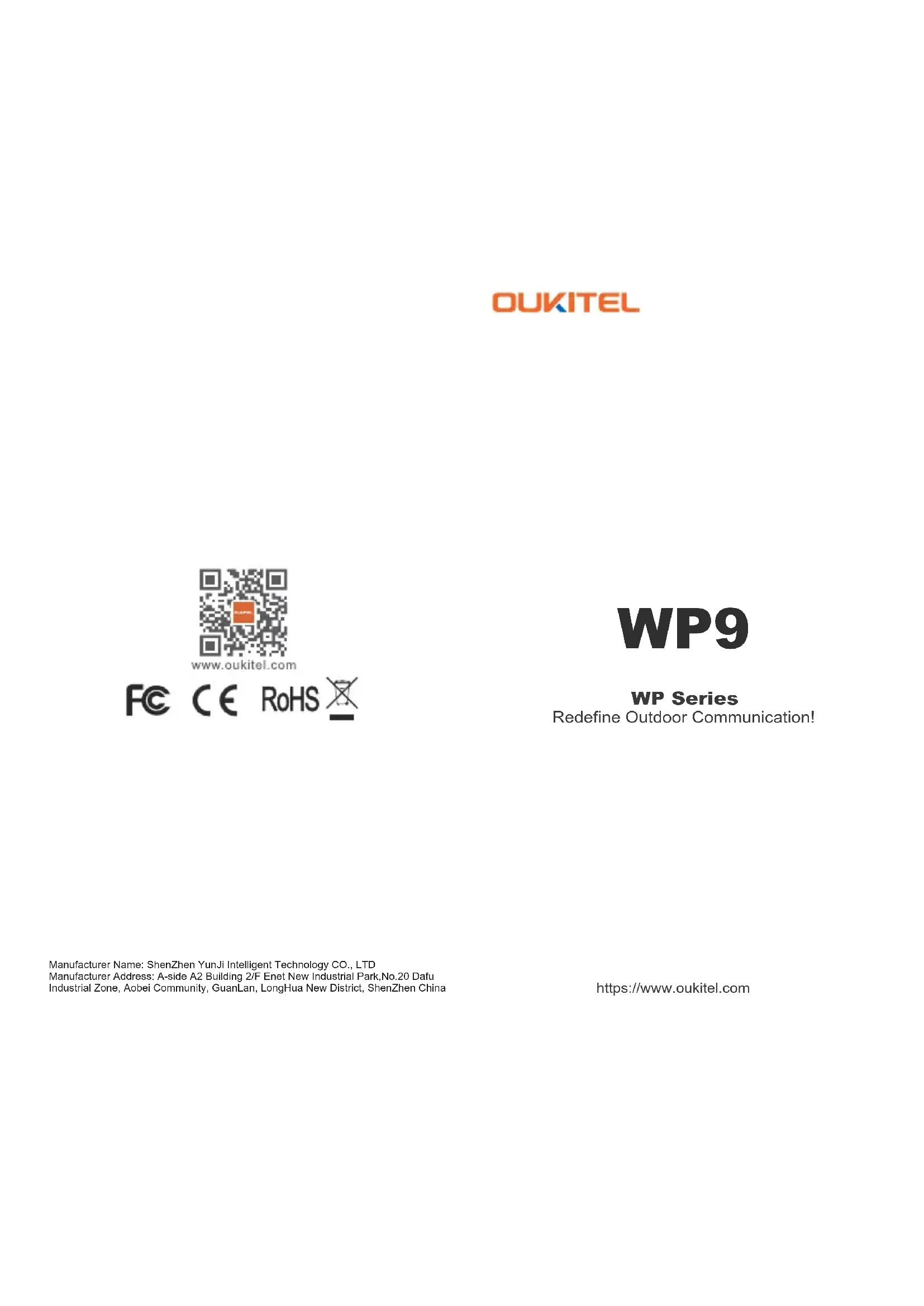WP9 WP Series Redefine Outdoor Communication! https://www.oukitel.com Manufacturer Name: ShenZhen YunJi Intelligent Technology CO., LTD Manufacturer Address: A-side A2 Building 2/F Enet New Industrial Park,No.20 Dafu Industrial Zone, Aobei Community, GuanLan, LongHua New District, ShenZhen ChinaBattery Warning 18W Fast Charging Accessories WP9 includes an internal battery.You can track your battery status with the icon showed on the top right of the screen. Use only OUKITEL-approved batteries specifically designed for you phone. Incompatible batteries can cause serious injuries or damage to your phone. Never place batteries or phones on or in heating devices such as microwave ovens,stoves,or radiators.Batteries may explode when overheated.