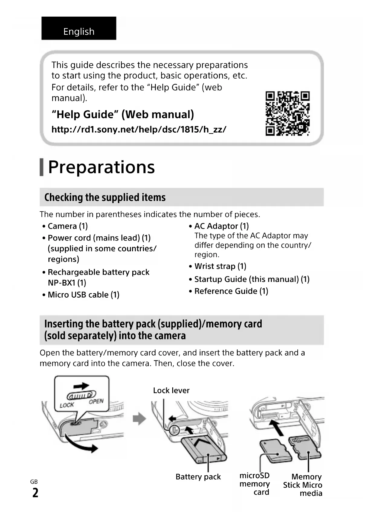 \\Win-473\camera\CX64400(ZLC)\Multi\06_Compose\4746011311_15lang\4746011311DSCHX99CE3\01GB-DSCHX99CE3\01GB.indd DTP data saved: 2018/08/20 13:53 PDF file created: 2018/08/30 10:18 English Preparations Checking the supplied items The number in parentheses indicates the number of pieces.• Camera (1)• Power cord (mains lead) (1) (supplied in some countries/regions)• Rechargeable battery pack NP-BX1 (1)• Micro USB cable (1)• AC Adaptor (1)The type of the AC Adaptor may differ depending on the country/region.• Wrist strap (1)• Startup Guide (this manual) (1)• Reference Guide (1) Inserting the battery pack (supplied)/memory card (sold separately) into the camera Open the battery/memory card cover, and insert the battery pack and a memory card into the camera. Then, close the cover.microSD memory card Memory Stick Micro mediaBattery packLock lever This guide describes the necessary preparations to start using the product, basic operations, etc. For details, refer to the “Help Guide” (web manual). “Help Guide” (Web manual) http://rd1.sony.net/help/dsc/1815/h_zz/DSC-HX99/DSC-HX95/DSC-WX800/DSC-WX7004-746-011-31(1)