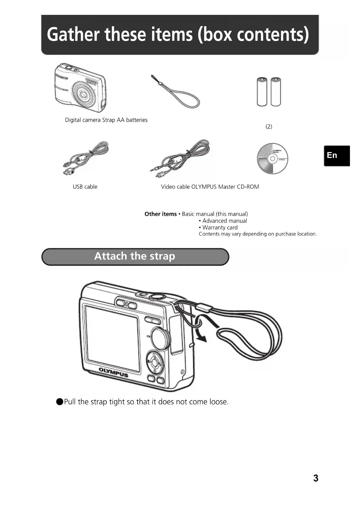 Gather these items (box contents) Attach the strap ( Pull the strap tight so that it does not come loose. Digital camera Strap AA batteries (2) USB cableVideo cable OLYMPUS Master CD-ROMOther items • Basic manual (this manual)• Advanced manual• Warranty cardContents may vary depending on purchase location. d4324_oai_basic_00_bookfile.book Page 3 Wednesday, July 5, 2006 2:39 PM4