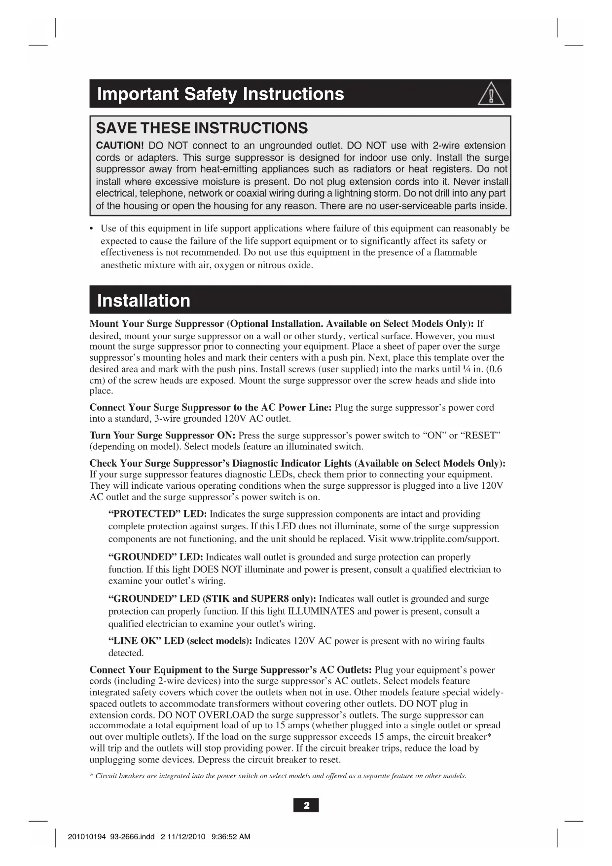 - Use of this equipment in life support applications where failure of this equipment can reasonably be expected to cause the failure of the life support equipment or to significantly affect its safety or effectiveness is not recommended. Do not use this equipment in the presence of a flammable anesthetic mixture with air, oxygen or nitrous oxide. Installation Mount Your Surge Suppressor (Optional Installation. Available on Select Models Only): If desired, mount your surge suppressor on a wall or other sturdy, vertical surface. However, you must mount the surge suppressor prior to connecting your equipment. Place a sheet of paper over the surge suppressor’s mounting holes and mark their centers with a push pin. Next, place this template over the desired area and mark with the push pins. Install screws (user supplied) into the marks until ¼ in. (0.6 cm) of the screw heads are exposed. Mount the surge suppressor over the screw heads and slide into place. Connect Your Surge Suppressor to the AC Power Line: Plug the surge suppressor’s power cord into a standard, 3-wire grounded 120V AC outlet. Turn Your Surge Suppressor ON: Press the surge suppressor’s power switch to “ON” or “RESET” (depending on model). Select models feature an illuminated switch. Check Your Surge Suppressor’s Diagnostic Indicator Lights (Available on Select Models Only): If your surge suppressor features diagnostic LEDs, check them prior to connecting your equipment. They will indicate various operating conditions when the surge suppressor is plugged into a live 120V AC outlet and the surge suppressor’s power switch is on. “PROTECTED” LED: Indicates the surge suppression components are intact and providing complete protection against surges. If this LED does not illuminate, some of the surge suppression components are not functioning, and the unit should be replaced. Visit www.tripplite.com/support. “GROUNDED” LED: Indicates wall outlet is grounded and surge protection can properly function. If this light DOES NOT illuminate and power is present, consult a qualified electrician to examine your outlet’s wiring. “GROUNDED” LED (STIK and SUPER8 only): Indicates wall outlet is grounded and surge protection can properly function. If this light ILLUMINATES and power is present, consult a qualified electrician to examine your outlet's wiring. “LINE OK” LED (select models): Indicates 120V AC power is present with no wiring faults detected. Connect Your Equipment to the Surge Suppressor’s AC Outlets: Plug your equipment’s power cords (including 2-wire devices) into the surge suppressor’s AC outlets. Select models feature integrated safety covers which cover the outlets when not in use. Other models feature special widely- spaced outlets to accommodate transformers without covering other outlets. DO NOT plug in extension cords. DO NOT OVERLOAD the surge suppressor’s outlets. The surge suppressor can accommodate a total equipment load of up to 15 amps (whether plugged into a single outlet or spread out over multiple outlets). If the load on the surge suppressor exceeds 15 amps, the circuit breaker* will trip and the outlets will stop providing power. If the circuit breaker trips, reduce the load by unplugging some devices. Depress the circuit breaker to reset.