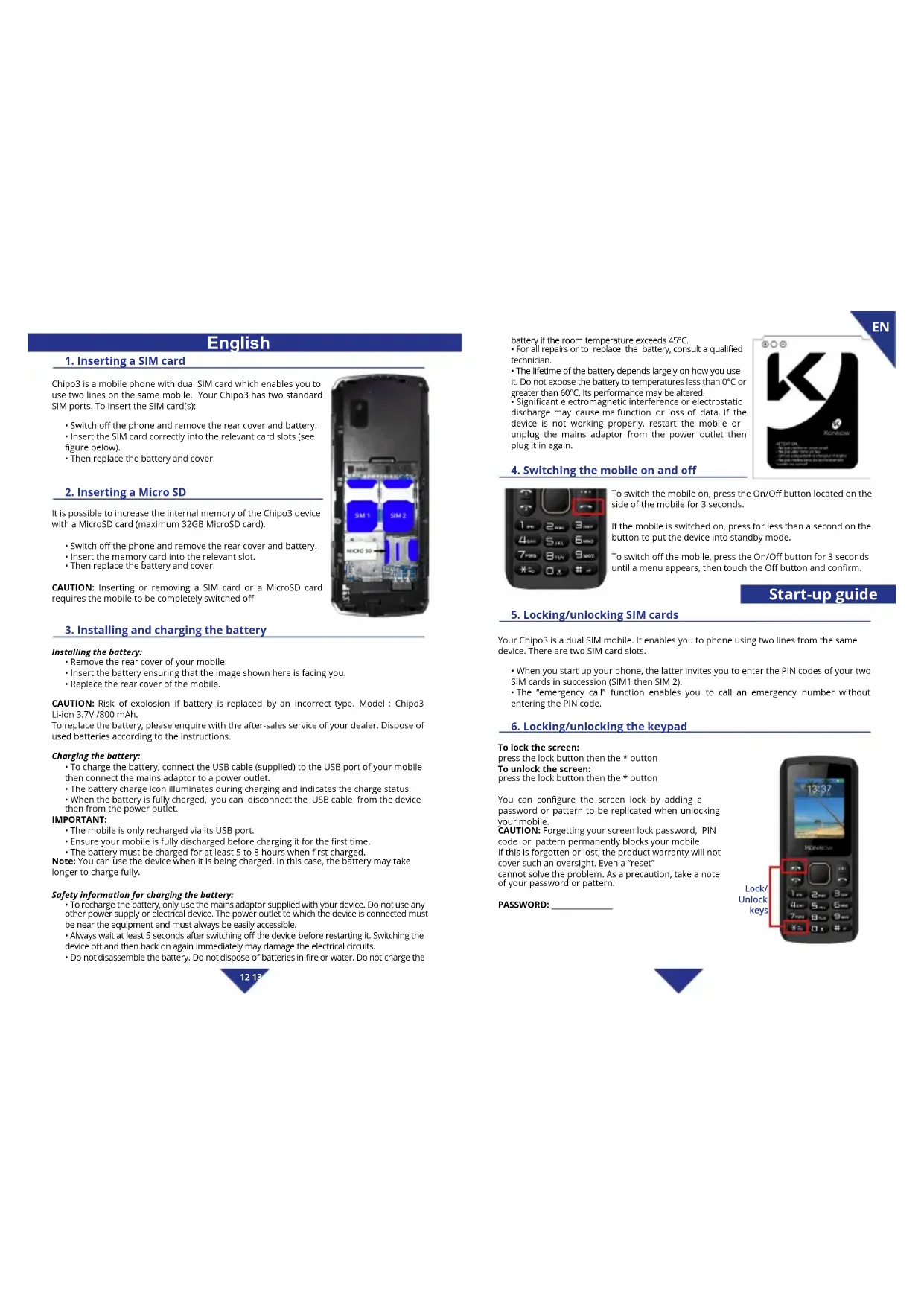 To lock the screen: press the lock button then the * button To unlock the screen: press the lock button then the * button You can congure the screen lock by adding a password or pattern to be replicated when unlocking your mobile. CAUTION: Forgetting your screen lock password, PIN code or pattern permanently blocks your mobile. If this is forgotten or lost, the product warranty will not cover such an oversight. Even a “reset” cannot solve the problem. As a precaution, take a note of your password or pattern. PASSWORD: _________________ Start-up guide Lock/ Unlock keysEN
