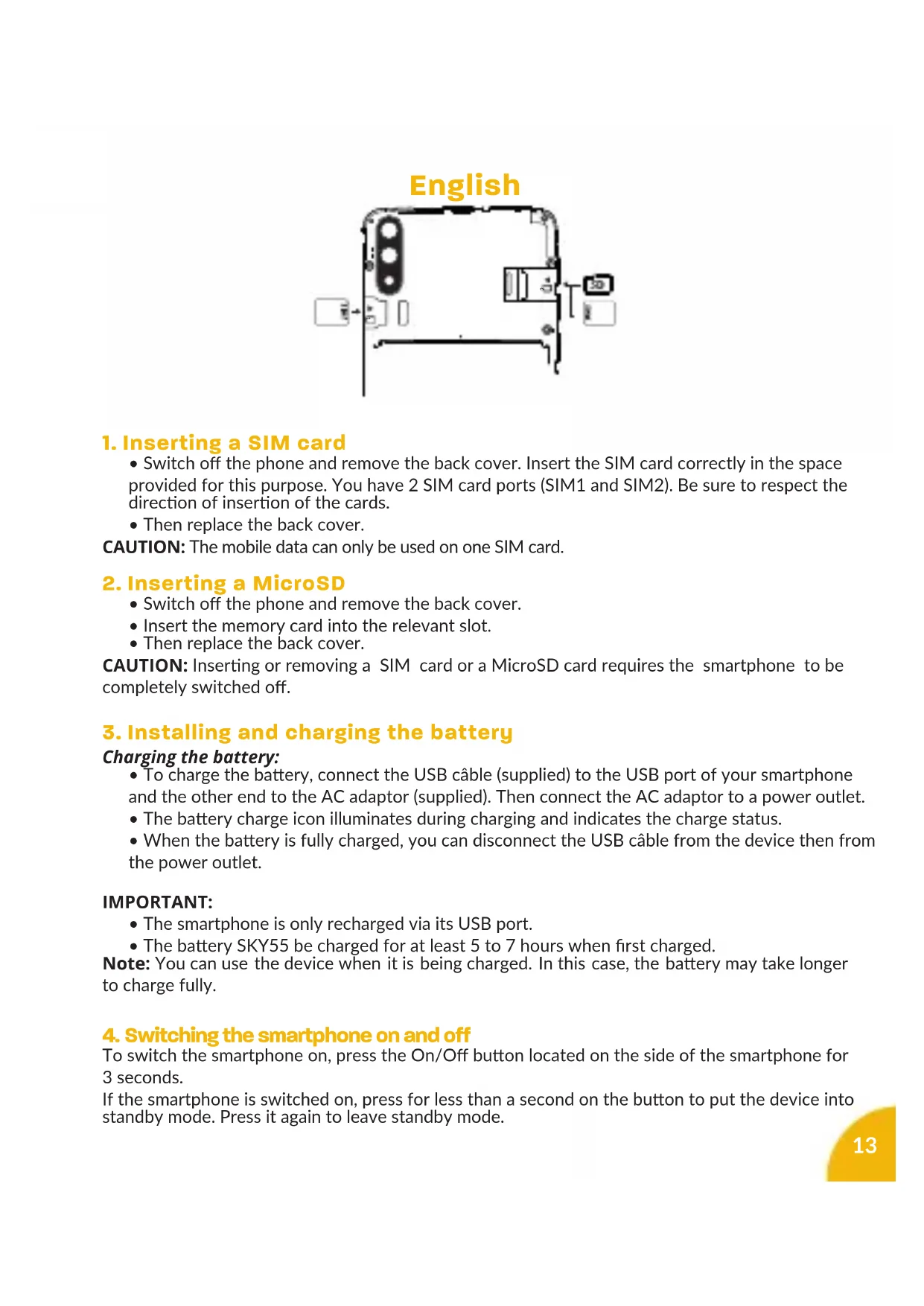 To switch the smartphone on, press the On/O buon located on the side of the smartphone for 3 seconds. If the smartphone is switched on, press for less than a second on the buon to put the device into standby mode. Press it again to leave standby mode. English