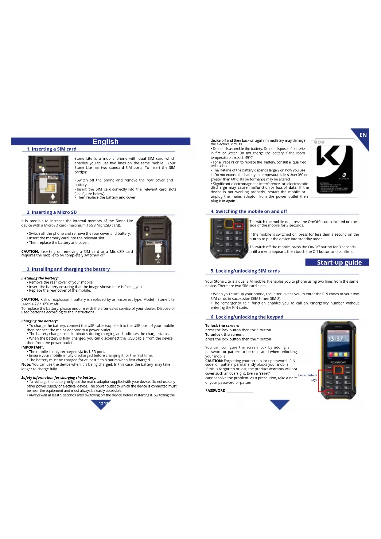 To lock the screen: press the lock button then the * button To unlock the screen: press the lock button then the * button You can congure the screen lock by adding a password or pattern to be replicated when unlocking your mobile. CAUTION: Forgetting your screen lock password, PIN code or pattern permanently blocks your mobile. If this is forgotten or lost, the product warranty will not cover such an oversight. Even a “reset” cannot solve the problem. As a precaution, take a note of your password or pattern. PASSWORD: _________________ Start-up guide Lock/Unlock keysEN