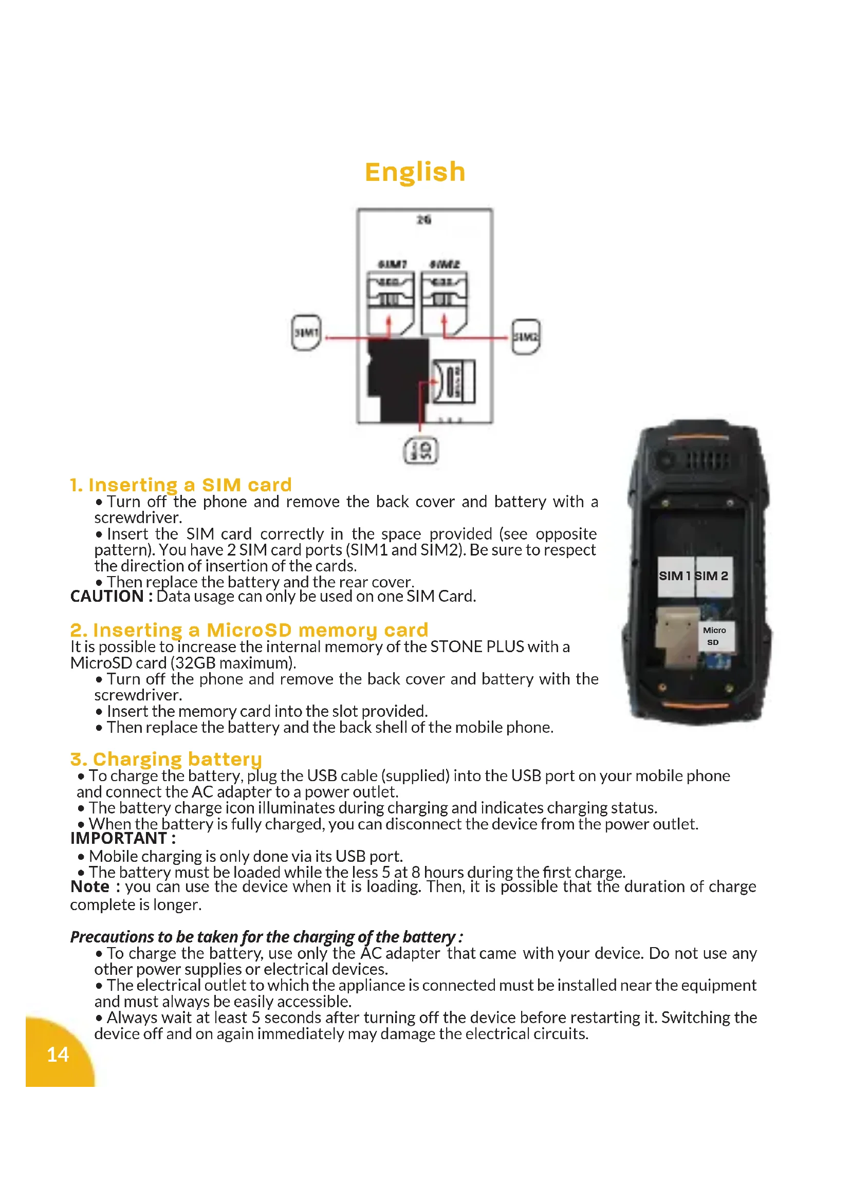 - To turn off the phone, press and hold the On/Off button for 3 seconds. 5.Lock/Unlock SIM cards Your STONE PLUS is a dual SIM mobile, it allows you to call with two subscriptions on the same device. There are two slots for two SIM cards. When you start your mobile, it will prompt you to enter the PIN code of your two SIM cards successively. (SIM1 then SIM 2). 6.Lock/Unlock Keyboard To unlock the keyboard :
