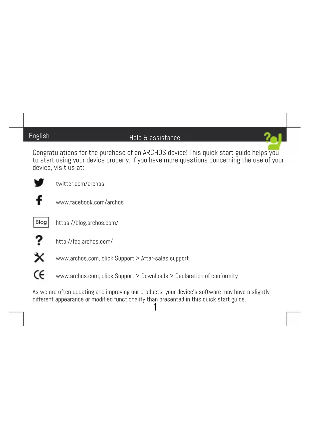 Help & assistance Congratulations for the purchase of an ARCHOS device! This quick start guide helps you to start using your device properly. If you have more questions concerning the use of your device, visit us at: twitter.com/archos www.facebook.com/archos Blog https://blog.archos.com/ http://faq.archos.com/ www.archos.com, click Support > After-sales support www.archos.com, click Support > Downloads > Declaration of conformity As we are often updating and improving our products, your device’s software may have a slightly different appearance or modified functionality than presented in this quick start guide. English2 Warranty Unboxing ARCHOS 50b Cobalt Lite Quick start guide Warranty, legal and safety notice Charging cable Charger adapter3 Describing your device Front camera Phone speaker Headphone jack Rear camera Flash light ON/OFF Volume Micro-USB port Light sensor Fingerprint reader Loudspeaker Microphone4 After you have unpacked your mobile phone box:
