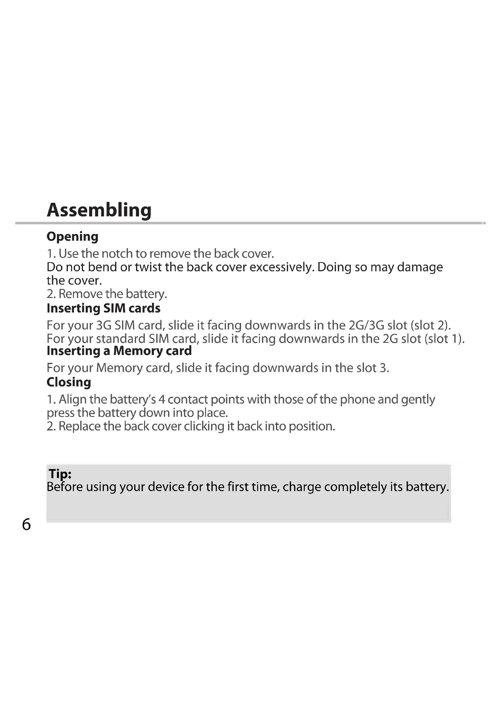 Tip: Before using your device for the first time, charge completely its battery.7 Picture to show how to removed the bottom casing Picture to show how to insert the battery pack Picture to show the scards position Picture to show how to removed the bottom casing Picture to show how to insert the battery pack Picture to show the scards position Picture to show how to removed the bottom casing Picture to show how to insert the battery pack Picture to show the scards position Slot 1 Slot 2 Slot 3 Picture to show how to removed the bottom casing Picture to show how to insert the battery pack Picture to show the scards position