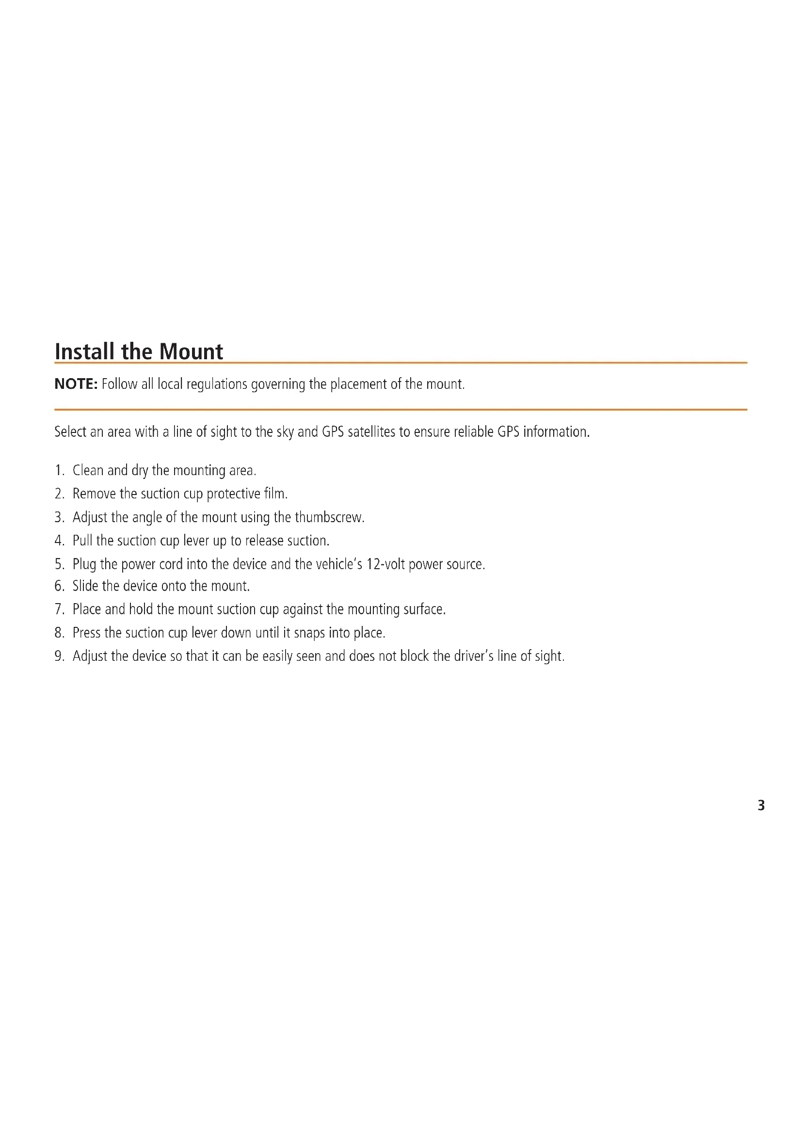 RAND MCNALLY DOCK: Keep your device up to date by downloading the Rand McNally Dock for your home computer at www.randmcnally.com/dock and connecting your device with the USB cable provided. LEARN MORE: Access Tutorial under Preferences > General on your device for more information, or visit www.randmcnally.com/support to download the user manual. POWER BUTTON: Press and hold the orange power button to turn the device on or off. The power button can also be used for quick access to certain features while the device is running. See Preferences > General > Quick Power Press for options. A red light indicates the battery is charging; a green light indicates the battery is fully charged. RESET: Use the reset button on the back of the device to restart. This will cancel the current route, but preferences, address book, and other personal data will be saved. Some screens include help tips. Tap this button to access. 12Install the Mount NOTE: Follow all local regulations governing the placement of the mount. Select an area with a line of sight to the sky and GPS satellites to ensure reliable GPS information.