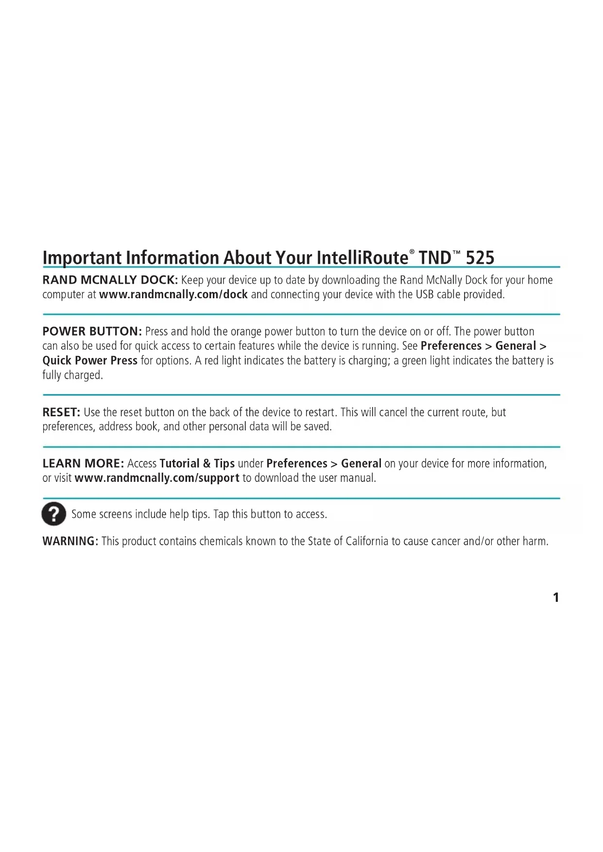 RAND MCNALLY DOCK: Keep your device up to date by downloading the Rand McNally Dock for your home computer at www.randmcnally.com/dock and connecting your device with the USB cable provided. POWER BUTTON: Press and hold the orange power button to turn the device on or off. The power button can also be used for quick access to certain features while the device is running. See Preferences > General > Quick Power Press for options. A red light indicates the battery is charging; a green light indicates the battery is fully charged. RESET: Use the reset button on the back of the device to restart. This will cancel the current route, but preferences, address book, and other personal data will be saved. LEARN MORE: Access Tutorial & Tips under Preferences > General on your device for more information, or visit www.randmcnally.com/support to download the user manual. Some screens include help tips. Tap this button to access.