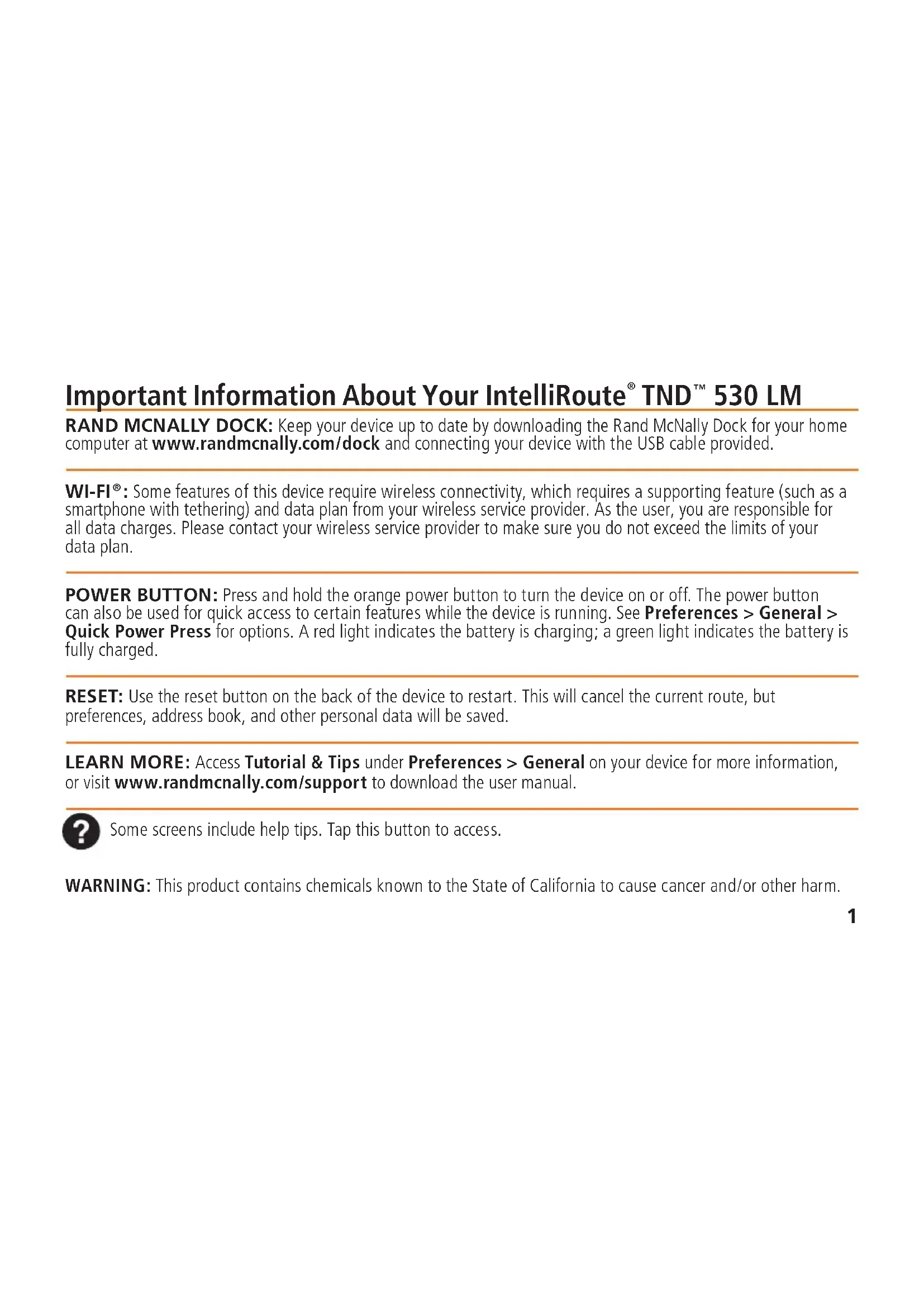 : Some features of this device require wireless connectivity, which requires a supporting feature (such as a smartphone with tethering) and data plan from your wireless service provider. As the user, you are responsible for all data charges. Please contact your wireless service provider to make sure you do not exceed the limits of your data plan. POWER BUTTON: Press and hold the orange power button to turn the device on or off. The power button can also be used for quick access to certain features while the device is running. See Preferences > General > Quick Power Press for options. A red light indicates the battery is charging; a green light indicates the battery is fully charged. RESET: Use the reset button on the back of the device to restart. This will cancel the current route, but preferences, address book, and other personal data will be saved. LEARN MORE: Access Tutorial & Tips under Preferences > General on your device for more information, or visit www.randmcnally.com/support to download the user manual. Some screens include help tips. Tap this button to access.