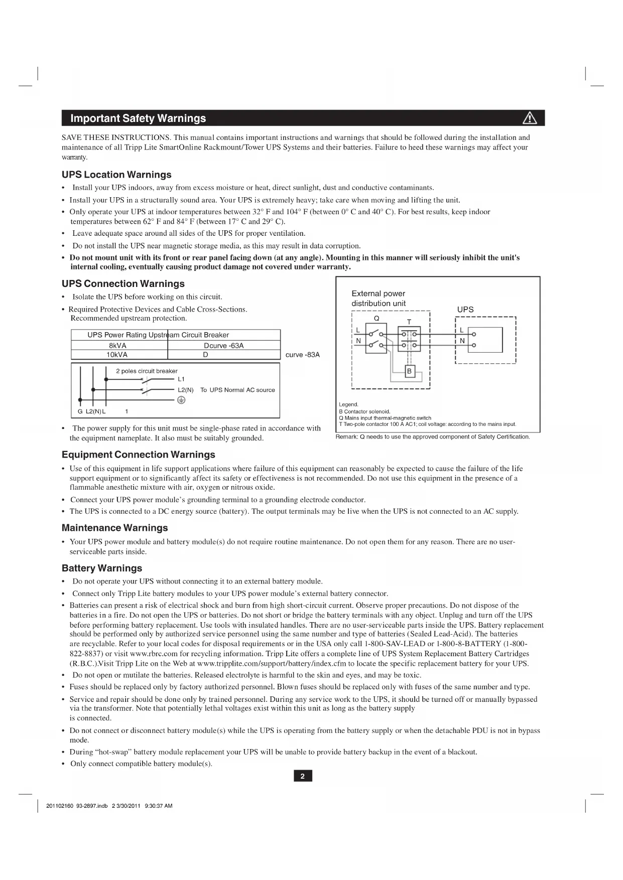 - Detachable PDU features outlets and maintenance bypass switch* • Rackmount and tower adaptable *An optional detachable hardwire PDU is available; contact Tripp Lite for details.Not suitable for mobile applications. Important Safety Warnings 2 Mounting 3 Connection 6 Features 4 Operation 12 Storage and Service 26 Warranty and Warranty Registration 26 Optional Connection 8 Manual Bypass Operation 9 Specifications 11 WARRANTY REGISTRATION:register online today for a chance to win a FREE Tripp Lite product—www.tripplite.com/warranty Español 27 Français 53 Ðóññêèé 79 201102160 93-2897.indb 1 3/30/2011 9:30:37 AM2 Important Safety Warnings SAVE THESE INSTRUCTIONS. This manual contains important instructions and warnings that should be followed during the installation and maintenance of all Tripp Lite SmartOnline Rackmount/Tower UPS Systems and their batteries. Failure to heed these warnings may affect your warranty. UPS Location Warnings
