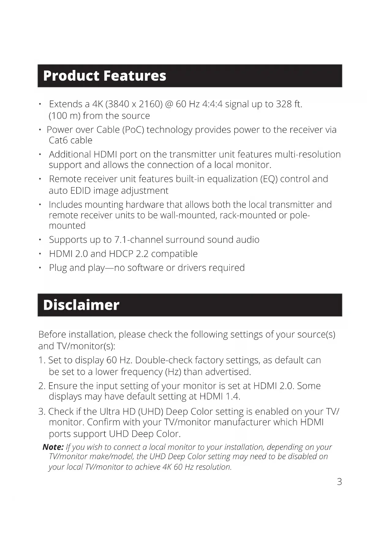 - Plug and play—no software or drivers required Disclaimer Before installation, please check the following settings of your source(s) and TV/monitor(s):