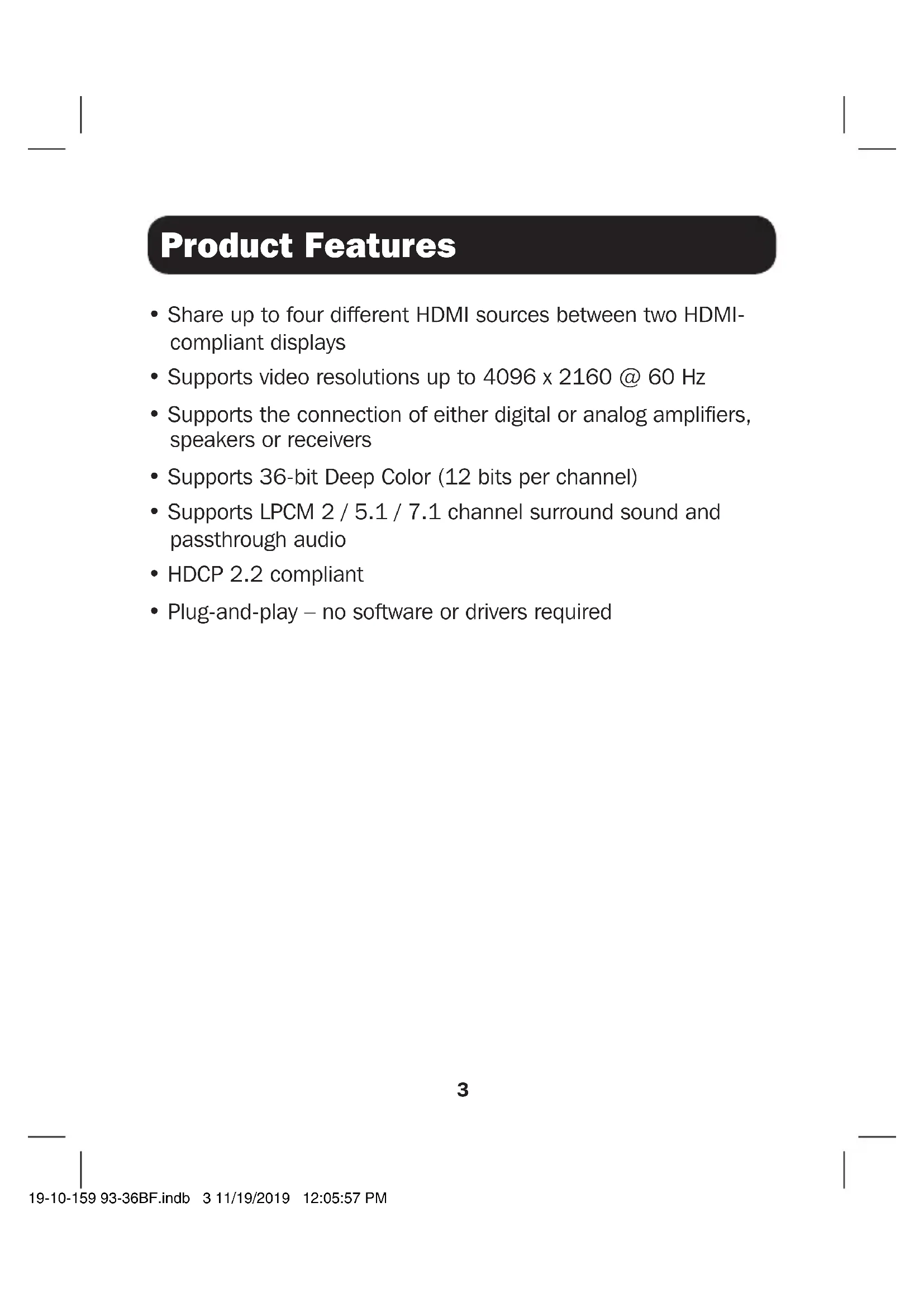 - Send the new equipment back for recycling when this ultimately becomes waste Use of this equipment in life support applications where failure of this equipment can reasonably be expected to cause the failure of the life support equipment or to significantly affect its safety or effectiveness is not recommended. Tripp Lite has a policy of continuous improvement. Specifications are subject to change without notice. Photos and illustrations may differ slightly from actual product. 1111 W. 35th Street, Chicago, IL 60609 USA • tripplite.com/support 19-10-159 93-3B6F_RevA 19-10-159 93-36BF.indb 12 11/19/2019 12:05:59 PM13 Manual del Propietario Interruptor/Divisor de Matriz HDMI con Extractor de Audio, 4K x 2K a 60 Hz, Modelo: B118-2X4-4K-A 1111 W. 35th Street, Chicago, IL 60609 EE. UU. • tripplite.com/supportCopyright © 2019 Tripp Lite. Todos los derechos reservados.MÁS DE AÑOS English 1 • Français 25 • Русский 37 19-10-159 93-36BF.indb 13 11/19/2019 12:05:59 PM14 Contenido de la Caja Accesorios Opcionales