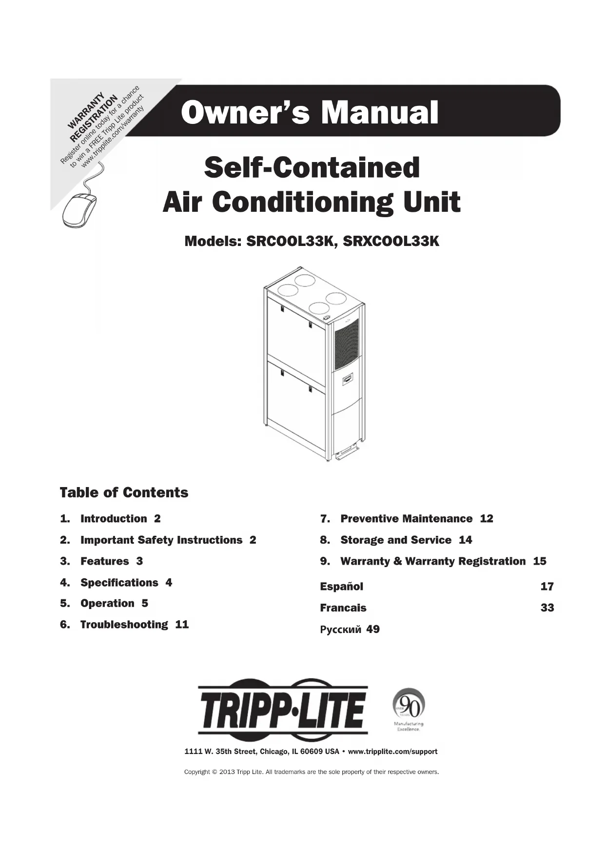 Español 17 Francais 33 Русский 49 Self-Contained Air Conditioning Unit Models: SRCOOL33K, SRXCOOL33K Owner’s Manual 1111 W. 35th Street, Chicago, IL 60609 USA • www.tripplite.com/supportCopyright © 2013 Tripp Lite. All trademarks are the sole property of their respective owners. WARRANTY REGISTRATION Register online today for a chance to win a FREE Tripp Lite product www.tripplite.com/warranty2