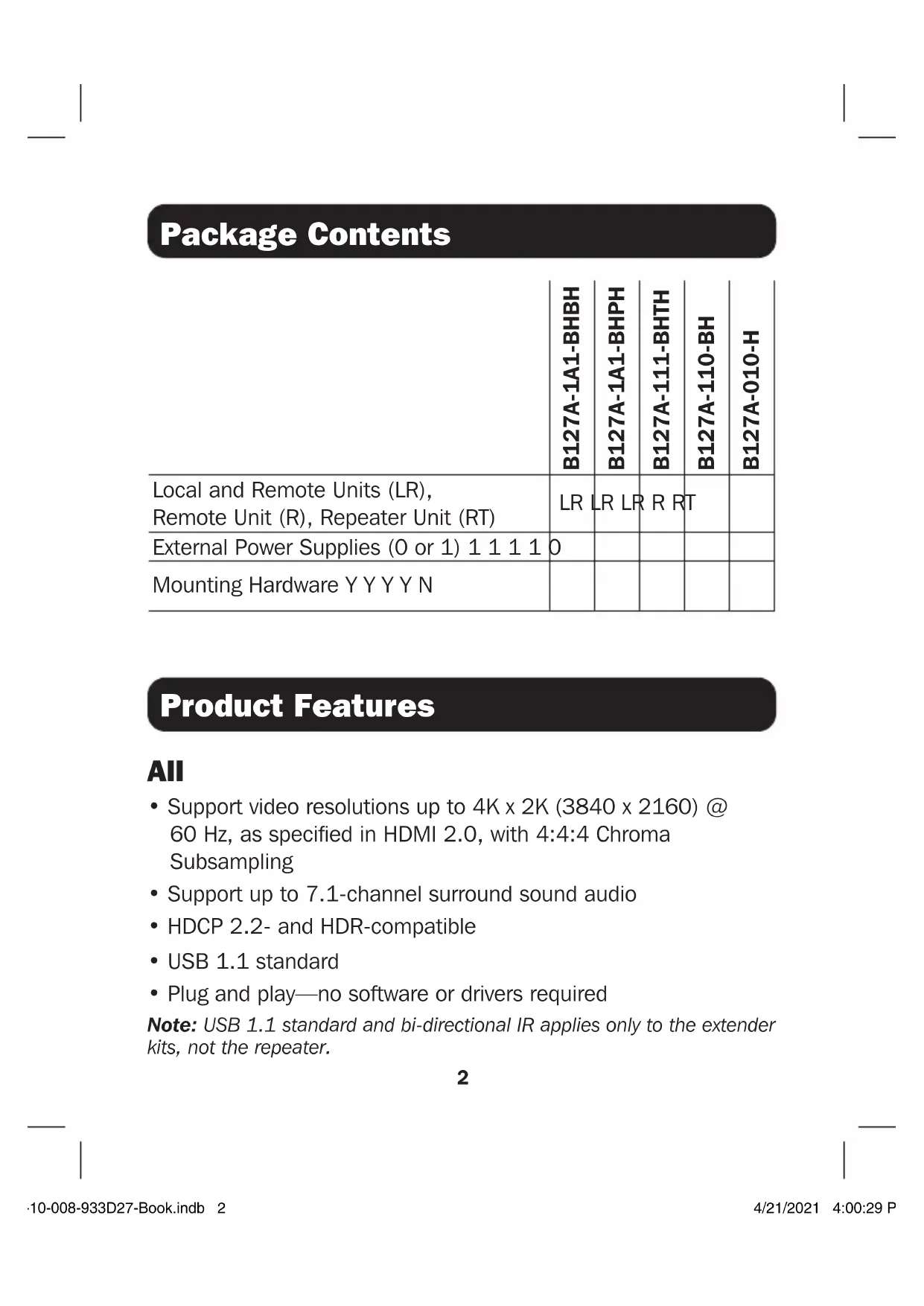 - Plug and play—no software or drivers required Note: USB 1.1 standard and bi-directional IR applies only to the extender kits, not the repeater. 20-10-008-933D27-Book.indb 220-10-008-933D27-Book.indb 2 4/21/2021 4:00:29 PM4/21/2021 4:00:29 PM3 Product Features