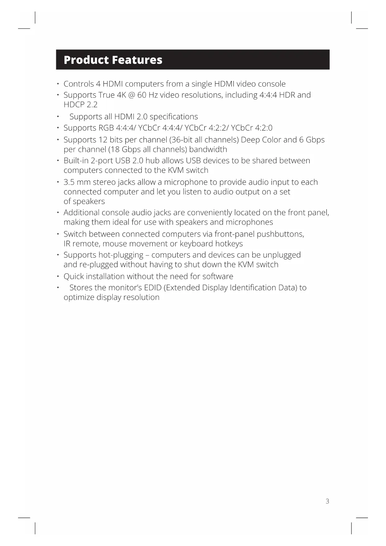 This mode only relates to hotkey function #4 and #6. Connectors KVM Connectors (Female) USB 3.2 Gen 1-B x4 (Rear) HDMI x4 (Rear)