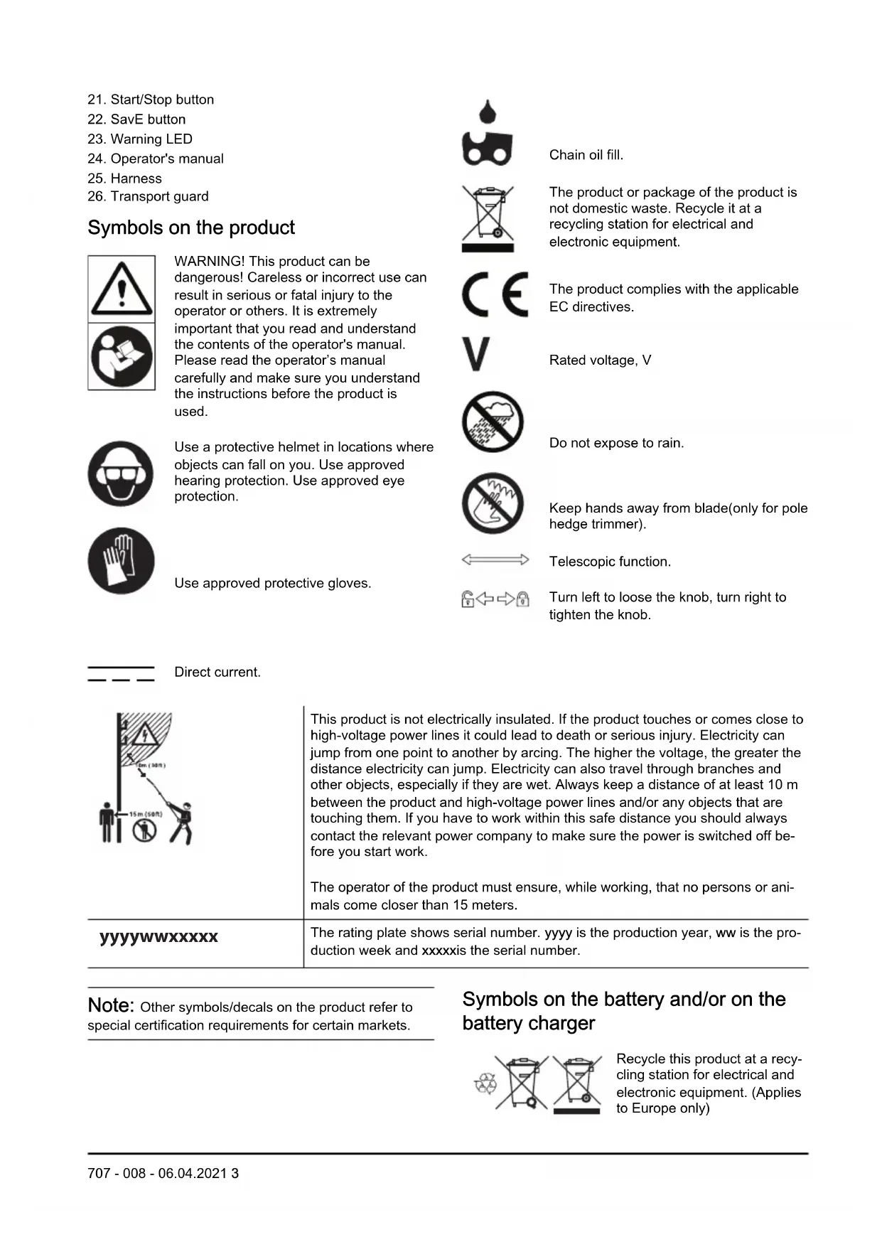 Symbols on the product WARNING! This product can be dangerous! Careless or incorrect use can result in serious or fatal injury to the operator or others. It is extremely important that you read and understand the contents of the operator's manual. Please read the operator’s manual carefully and make sure you understand the instructions before the product is used. Use a protective helmet in locations where objects can fall on you. Use approved hearing protection. Use approved eye protection. Use approved protective gloves. Direct current. Chain oil fill. The product or package of the product is not domestic waste. Recycle it at a recycling station for electrical and electronic equipment. The product complies with the applicable EC directives. Rated voltage, V Do not expose to rain. Keep hands away from blade(only for pole hedge trimmer). Telescopic function. Turn left to loose the knob, turn right to tighten the knob. This product is not electrically insulated. If the product touches or comes close to high-voltage power lines it could lead to death or serious injury. Electricity can jump from one point to another by arcing. The higher the voltage, the greater the distance electricity can jump. Electricity can also travel through branches and other objects, especially if they are wet. Always keep a distance of at least 10 m between the product and high-voltage power lines and/or any objects that are touching them. If you have to work within this safe distance you should always contact the relevant power company to make sure the power is switched off be- fore you start work. The operator of the product must ensure, while working, that no persons or ani- mals come closer than 15 meters. yyyywwxxxxx The rating plate shows serial number. yyyy is the production year, ww is the pro- duction week and xxxxxis the serial number. Note: Other symbols/decals on the product refer to special certification requirements for certain markets. Symbols on the battery and/or on the battery charger Recycle this product at a recy- cling station for electrical and electronic equipment. (Applies to Europe only)