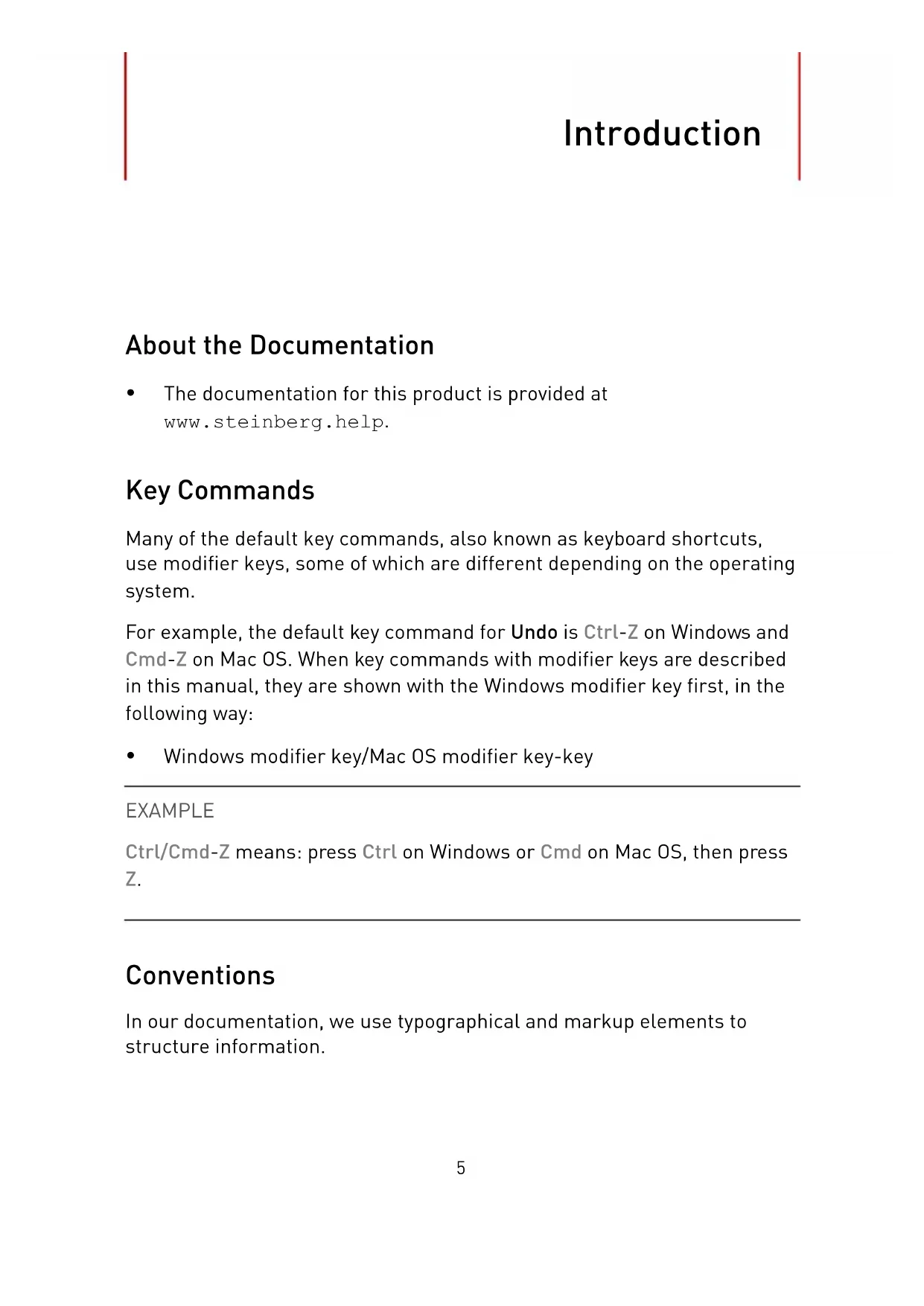 The documentation for this product is provided at www.steinberg.help. Key Commands Many of the default key commands, also known as keyboard shortcuts, use modifier keys, some of which are different depending on the operating system. For example, the default key command for Undo is Ctrl-Z on Windows and Cmd-Z on Mac OS. When key commands with modifier keys are described in this manual, they are shown with the Windows modifier key first, in the following way: