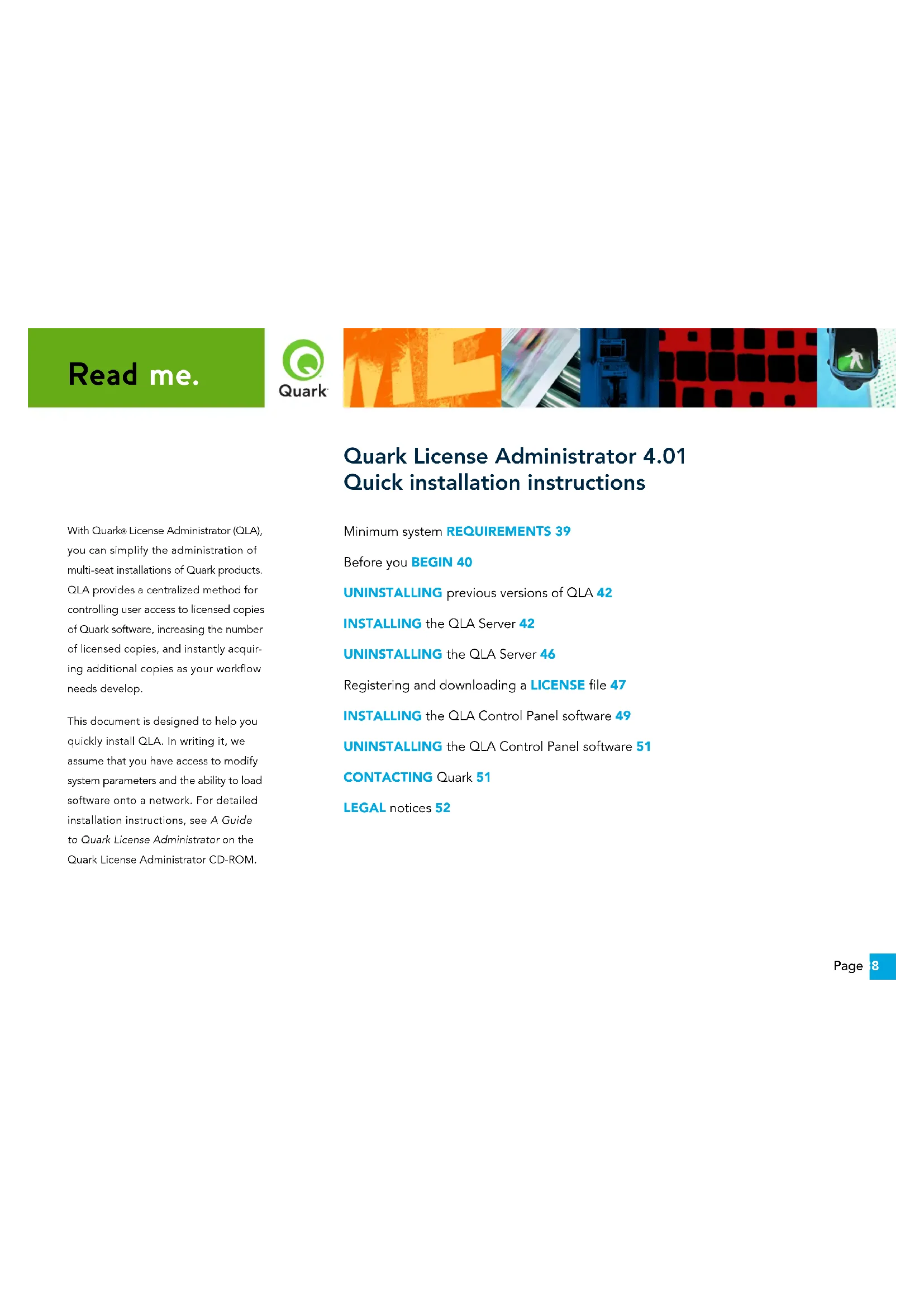 On Solaris, right-click the Download Now link and choose Save Link As from the context menu. NOTE Mac OS only: If you do not press Option while clicking Download, your Web browser might attempt to display the contents of the license file. NOTE Windows and Solaris only: If you are using Netscape as your browser application, right-click the Download link and choose Save Link As from the context menu. Otherwise, your Web browser might attempt to display the contents of the license file. The File Download dialog box displays. 2 Click Save this file to disk, then click OK. 3 Use the Save As dialog box to open the “Server” folder in your QLA application folder, then click Save. Make sure that the name of the license file is “QLALicense.dat”. NOTE Do not rename the file in the Save Current Document as (Mac OS) or File name (Windows and Solaris) field of the Save As dialog box. Renaming the license file will cause it to malfunction. 4 After the license file downloads, the Download License File page displays again. 5 If you are using a backup server, copy the “QLALicense.dat” file to the “Server” folder in the QLA application folder on the backup server before you start the primary server for the first time. Installing the QLA Control Panel software The QLA Control Panel software consists of the QLA Control Panel dialog box, which communicates with the server to help you moni- tor and configure license usage. You can install the QLA Control Panel on multiple computers to administer the licenses concurrently. Before you install, uninstall previous installations of QLA Control Panel. Mac OS 1 Disable any virus protection software. 2 Open the “QLA 4.01 Installers” folder on the QLA CD-ROM and double-click the “QLA Client 4.01 Installer” file. 3 The installation utility searches for a relevant Java version. When it is found, the Authenticate dialog box displays. 4 Enter the administrator user name and password and click OK. The Welcome dialog box displays. 5 Click Continue. The License Agreement dialog box displays. 6 Click Continue. The Agree/Disagree dialog box displays. Read me. Registering and downloading a license filePage 50 TOPICS 7 Click Agree. The Select Destination dialog box displays. NOTE You must accept the terms of the license agreement to continue. 8 Select the location to install the QLA Control Panel software and click Continue. The Server Information dialog box displays. 9 Enter the name of the computer where the primary QLA Server will reside in the Server Name field. This name can be the DNS name or the IP address. Quark technical staff recommends that you enter a static IP address in this field so your clients can always locate the server. NOTE Mac OS clients do not recognize DNS names. If Mac OS clients run on your network and your server is a Windows-compatible computer, enter an IP address in the Server Name field. 10 Enter the port number the primary QLA Server will use in the Server Port Number field. NOTE The port number must be between 1024 and 65535. 11 If you have a backup server, enter the IP address of the com- puter where the backup QLA Server will reside in the Backup Server Name field. 12 Enter the port number the backup QLA Server will use in the Backup Server Port field. 13 Click OK. The Installation Type dialog box displays. 14 Click Install. As items are installed, the Installing status bar progresses from empty to full. When all items are installed, the Finish Up dialog box displays. 15 Click Quit. Windows 1 Disable any virus protection software. 2 Open the “QLA 4.01 Installers” folder on the QLA CD-ROM and double-click the “QLA Client 4.01 Installer.exe” file. 3 Choose a language for the installer and click OK. The Welcome dialog box displays. 4 Click Next. The License Agreement dialog box displays. 5 Click I accept the terms of the license agreement, then click Next. The Installation Location dialog box displays. NOTE You must accept the terms of the license agreement to continue. 6 Enter the location to install the software, or click Browse to locate a destination folder, then click Next. The Server Information dialog box displays. 7 Enter the name of the computer where the primary QLA Server will reside in the Server Name field. This name can be the DNS name or the IP address. Quark technical staff recommends that you enter a static IP address in this field so your clients can always locate the server. 8 Enter the port number that the primary QLA Server will use in the Server Port Number field. Read me. Installing the QLA Control Panel softwarePage 51 TOPICS NOTE The port number must be between 1024 and 65535. 9 If you have a backup server, enter the name of the computer where the backup QLA Server will reside in the Backup Server Name field. 10 Enter the port number the backup QLA Server will use in the Backup Server Port field. 11 Click Next. As items are installed, the Installing status bar progresses from empty to full. When all items are installed, the Install Complete dialog box displays. 12 Click Finish. Uninstalling the QLA Control Panel software Before you uninstall the QLA Control Panel, ensure it is not running. If the uninstaller detects a running instance of the QLA Control Panel, an alert displays. Mac OS 1 Double-click the “QLA Client 4.01 Uninstaller” file in the “_uninstClient” folder within the “Quark_License_Administrator” application folder. The Welcome dialog box displays. 2 Click Continue. The Confirmation dialog box displays. 3 Click Yes. The Authenticate dialog box displays. 4 Enter the user name and password for the administrator and click OK. 5 The uninstaller begins removing the QLA application files. When uninstallation is complete, the Finish Up dialog box displays. 6 Click Quit. Windows 1 Choose Start menu Þ Programs Þ Quark License Administrator Þ Uninstall QLA Client. 2 Choose a language from the Language drop-down menu and click OK. The Welcome dialog box displays. 3 Click Next.