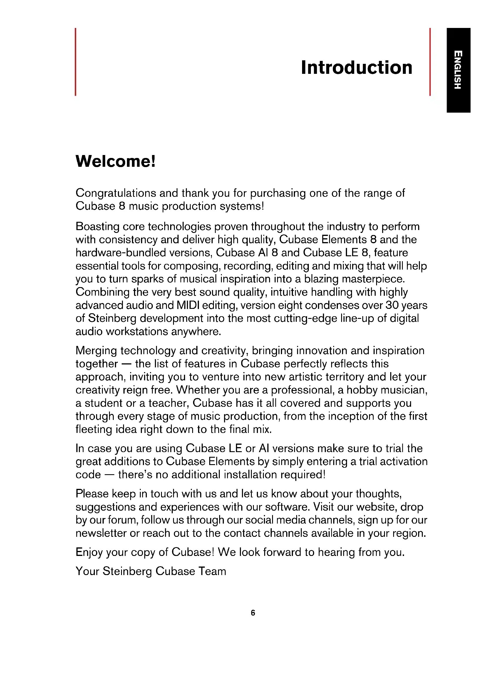 EnglishCristina Bachmann, Heiko Bischoff, Christina Kaboth, Insa Mingers, Matthias Obrecht, Sabine Pfeifer, Kevin Quarshie, Benjamin Schütte This PDF provides improved access for vision-impaired users. Please note that due to the complexity and number of images in this document, it is not possible to include text descriptions of images. The information in this document is subject to change without notice and does not represent a commitment on the part of Steinberg Media Technologies GmbH. The software described by this document is subject to a License Agreement and may not be copied to other media except as specifically allowed in the License Agreement. No part of this publication may be copied, reproduced, or otherwise transmitted or recorded, for any purpose, without prior written permission by Steinberg Media Technologies GmbH. Registered licensees of the product described herein may print one copy of this document for their personal use. All product and company names are ™ or ® trademarks of their respective owners. For more information, please visit www.steinberg.net/trademarks. © Steinberg Media Technologies GmbH, 2015. All rights reserved.4 ENGLISH Table of Contents 6 Introduction 6 Welcome! 7 About the Documentation and the Help 8 Typographical Conventions 9 How You Can Reach Us 10 System Requirements and Installation 10 System Requirements 11 Installing the Program 12 Activating Your License 15 Hardware Installation 17 Setting up Your System56 ENGLISH Introduction Welcome! Congratulations and thank you for purchasing one of the range of Cubase 8 music production systems! Boasting core technologies proven throughout the industry to perform with consistency and deliver high quality, Cubase Elements 8 and the hardware-bundled versions, Cubase AI 8 and Cubase LE 8, feature essential tools for composing, recording, editing and mixing that will help you to turn sparks of musical inspiration into a blazing masterpiece. Combining the very best sound quality, intuitive handling with highly advanced audio and MIDI editing, version eight condenses over 30 years of Steinberg development into the most cutting-edge line-up of digital audio workstations anywhere. Merging technology and creativity, bringing innovation and inspiration together — the list of features in Cubase perfectly reflects this approach, inviting you to venture into new artistic territory and let your creativity reign free. Whether you are a professional, a hobby musician, a student or a teacher, Cubase has it all covered and supports you through every stage of music production, from the inception of the first fleeting idea right down to the final mix. In case you are using Cubase LE or AI versions make sure to trial the great additions to Cubase Elements by simply entering a trial activation code — there’s no additional installation required! Please keep in touch with us and let us know about your thoughts, suggestions and experiences with our software. Visit our website, drop by our forum, follow us through our social media channels, sign up for our newsletter or reach out to the contact channels available in your region. Enjoy your copy of Cubase! We look forward to hearing from you. Your Steinberg Cubase TeamIntroduction About the Documentation and the Help