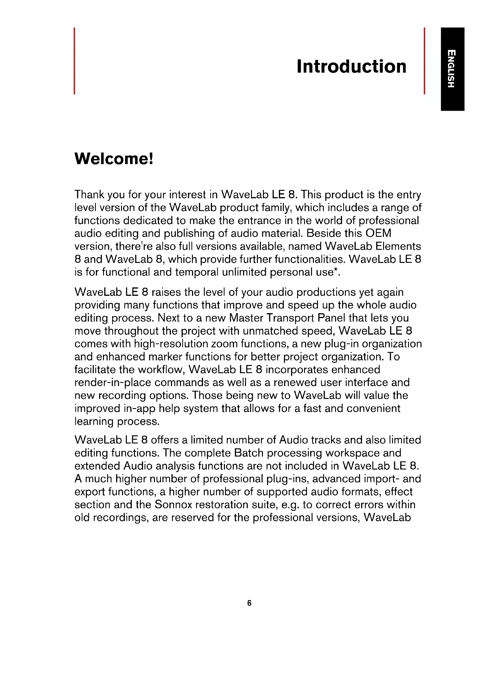 EnglishCristina Bachmann, Heiko Bischoff, Christina Kaboth, Insa Mingers, SabinePfeifer, Benjamin Schütte The PDF document provides improved access for vision-impaired users. Please note that due to the complexity and number of images in this document, it is not possible to include text descriptions of images. The information in this document is subject to change without notice and does not represent a commitment on the part of Steinberg Media Technologies GmbH. The software described by this document is subject to a License Agreement and may not be copied to other media except as specifically allowed in the License Agreement. No part of this publication may be copied, reproduced, or otherwise transmitted or recorded, for any purpose, without prior written permission by Steinberg Media Technologies GmbH. Registered licensees of the product described herein may print one copy of this document for their personal use. All product and company names are ™ or ® trademarks of their respective holders. F or more information, please visit www.steinberg.net/trademarks. Release Date: June 18, 2013 © Steinberg Media Technologies GmbH, 2013. All rights reserved.4 ENGLISH Table of Contents 6 Introduction 6 Welcome! 7 About the Documentation and the Help 8 Typographical Conventions 9 How You Can Reach Us 10 System Requirements and Installation 10 System Requirements 11 Installing the Program 12 Registering and Activating Your License 13 Hardware Installation 16 Setting up Your System56 ENGLISH Introduction Welcome! Thank you for your interest in WaveLab LE 8. This product is the entry level version of the WaveLab product family, which includes a range of functions dedicated to make the entrance in the world of professional audio editing and publishing of audio material. Beside this OEM version, there're also full versions available, named WaveLab Elements 8 and WaveLab 8, which provide further functionalities. WaveLab LE 8 is for functional and temporal unlimited personal use*. WaveLab LE 8 raises the level of your audio productions yet again providing many func tions that improve and speed up the whole audio editing process. Next to a new Master Transport Panel that lets you move throughout the project with unmatched speed, WaveLab LE 8 comes with high-resolution zoom functions, a new plug-in organization and enhanced marker functions for better project organization. To facilitate the workflow, WaveLab LE 8 incorporates enhanced render-in-place commands as well as a renewed user interface and new recording options. Those being new to WaveLab will value the improved in-app help system that allows for a fast and convenient learning process. WaveLab LE 8 offers a limited number of Audio tracks and also limited editing functions. The complete Batch processing workspace and extended Audio analysis functions are not included in WaveLab LE 8. A much higher number of professional plug-ins, advanced import- and export functions, a higher number of supported audio formats, effect section and the Sonnox restoration suite, e.g. to correct errors within old recordings, are reserved for the professional versions, WaveLabIntroduction About the Documentation and the Help