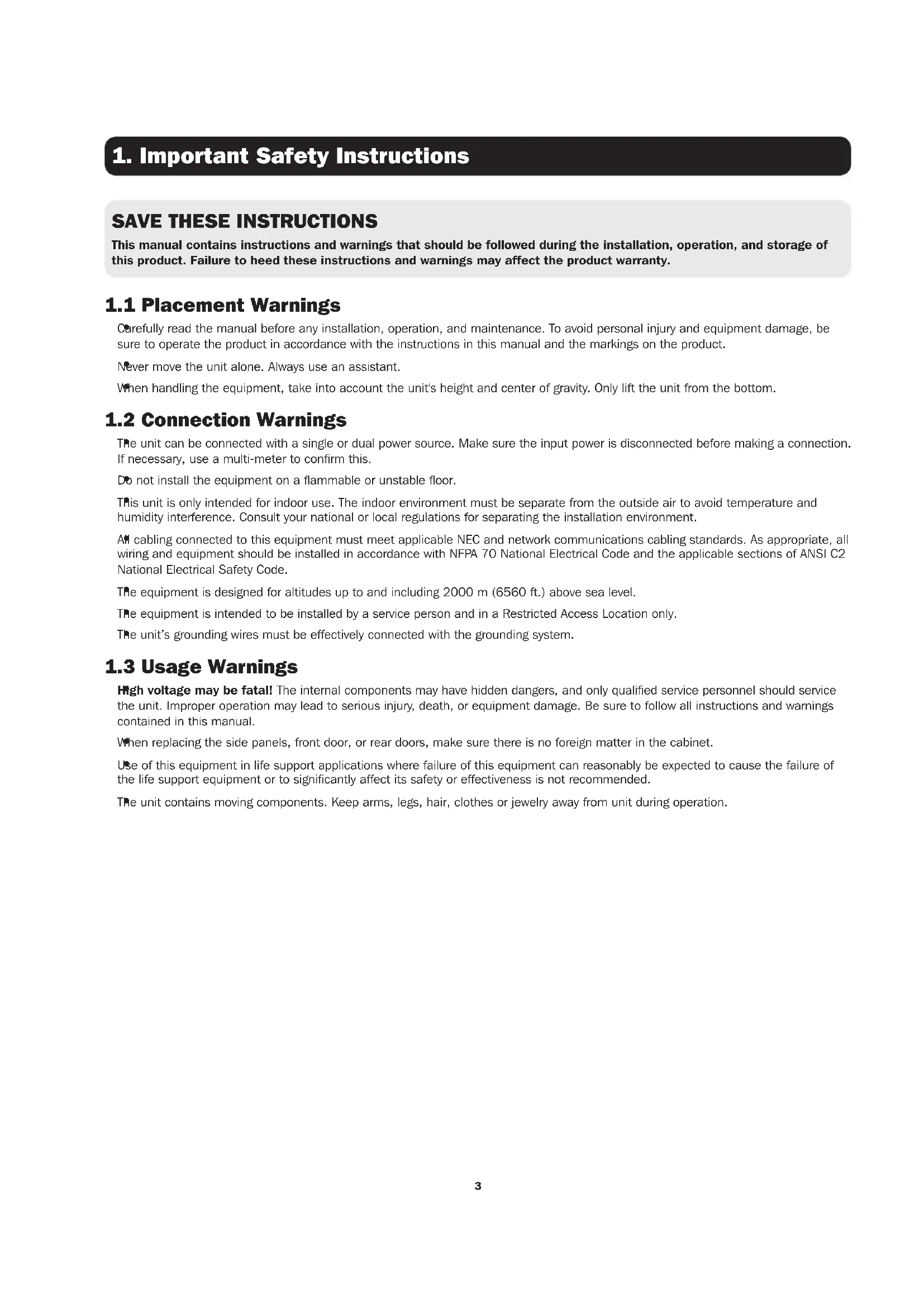 This manual contains instructions and warnings that should be followed during the installation, operation, and storage of this product. Failure to heed these instructions and warnings may affect the product warranty.4