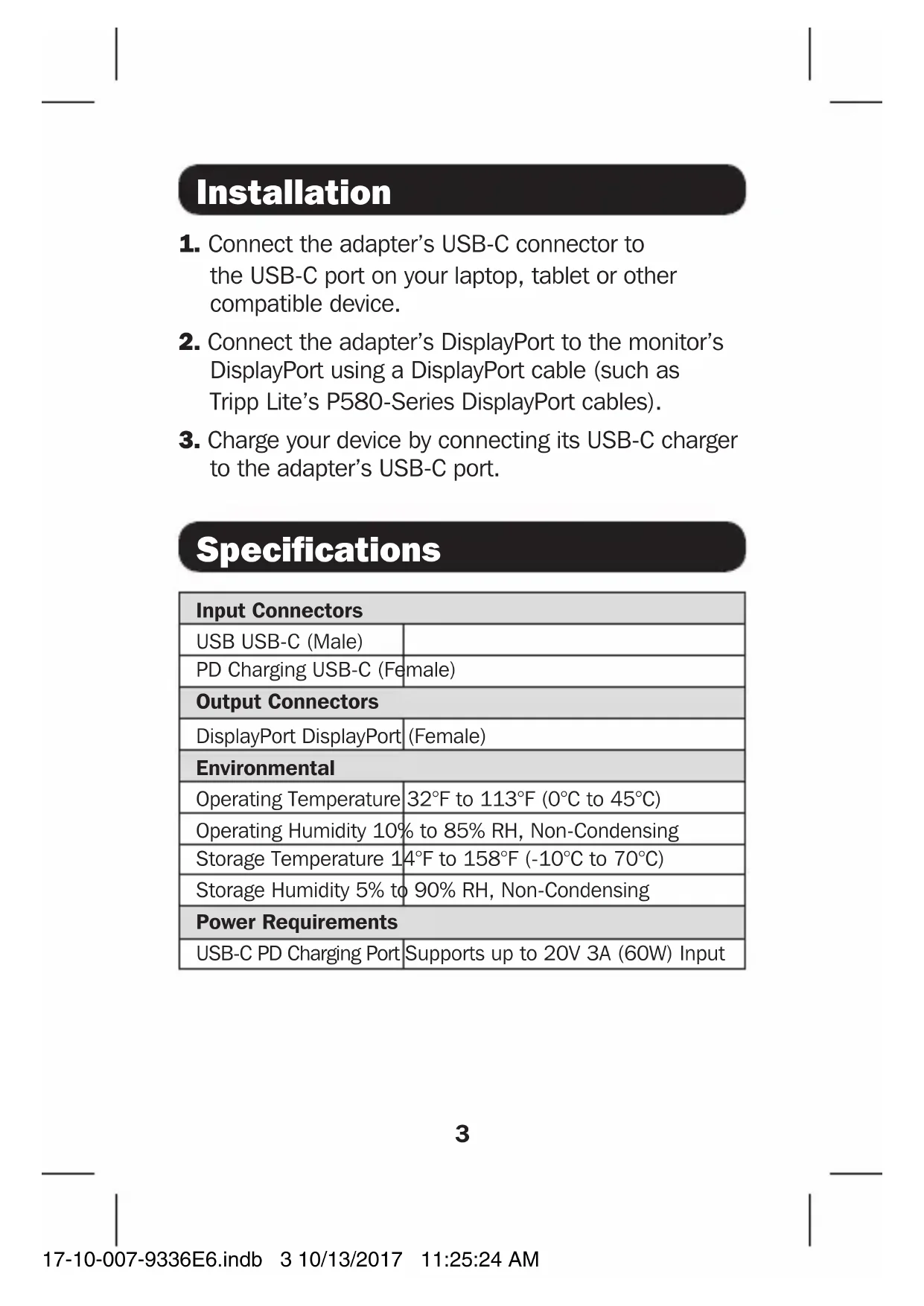 to the adapter’s USB-C port. Input Connectors USB USB-C (Male) PD Charging USB-C (Female) Output Connectors DisplayPort DisplayPort (Female) Environmental Operating Temperature 32°F to 113°F (0°C to 45°C) Operating Humidity 10% to 85% RH, Non-Condensing Storage Temperature 14°F to 158°F (-10°C to 70°C) Storage Humidity 5% to 90% RH, Non-Condensing Power Requirements USB-C PD Charging Port Supports up to 20V 3A (60W) Input Specifications 17-10-007-9336E6.indb 3 10/13/2017 11:25:24 AM4 Warranty and Product Registration